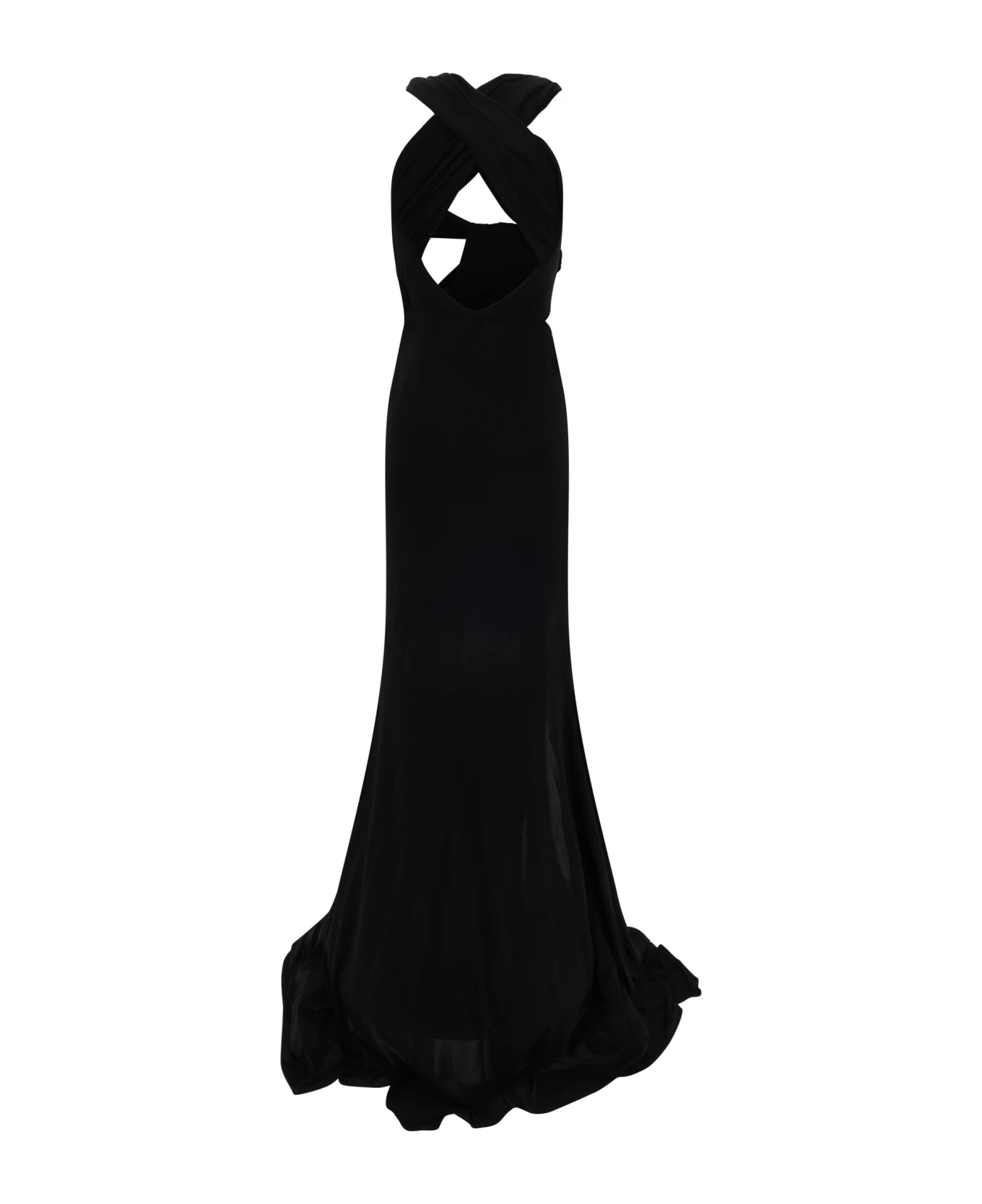 Long dara dress by the attico, front and back criss-cross design, criss-cross neckline, cut-out detail on front neckline, monochrome pattern, wide front slit, geometric cut-out detail on right hip, floor-length design, skirt with wide train, regular fit.
