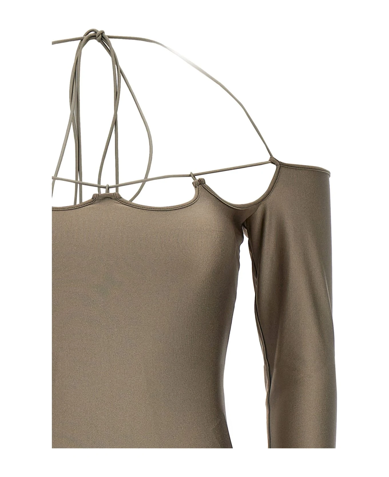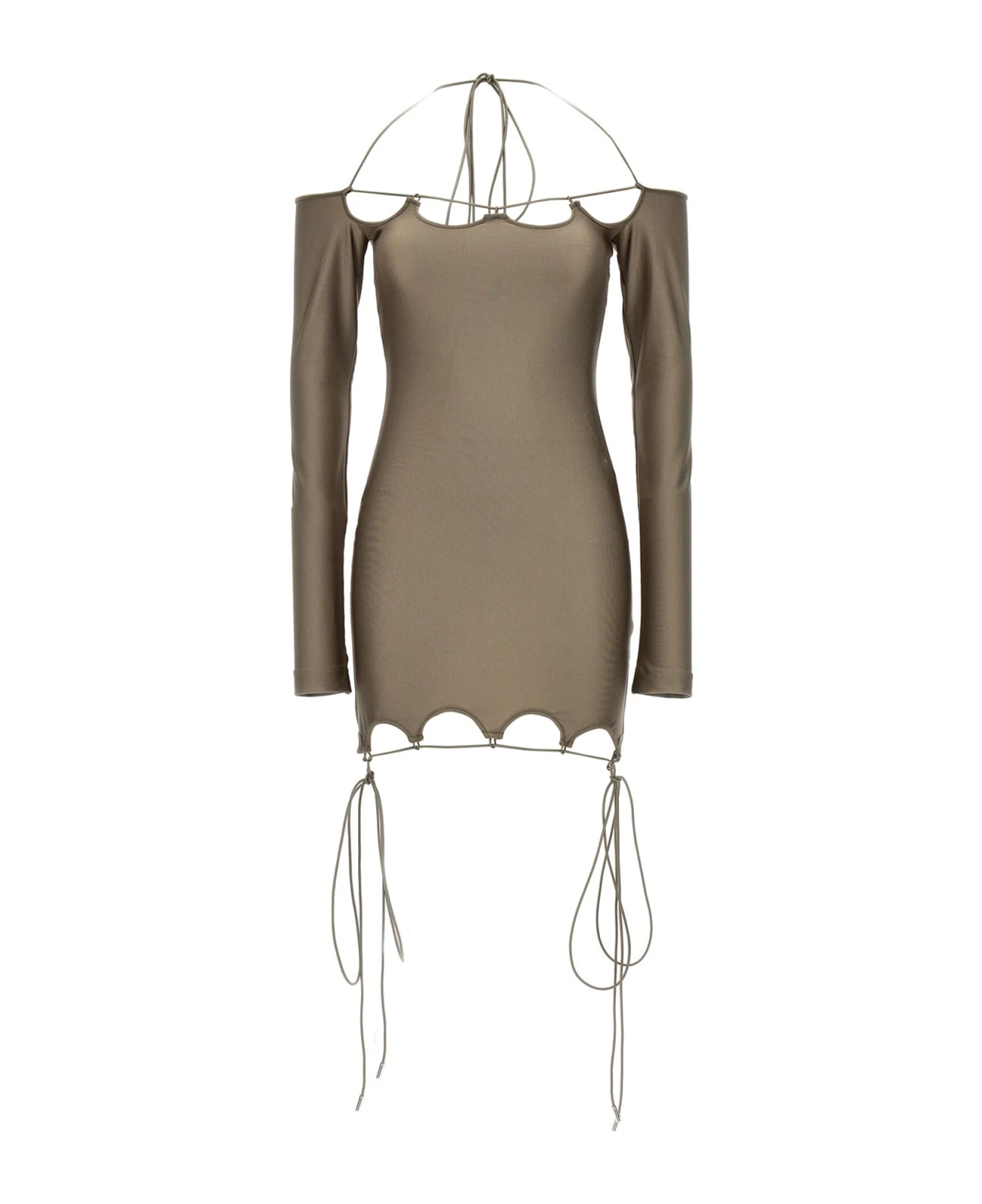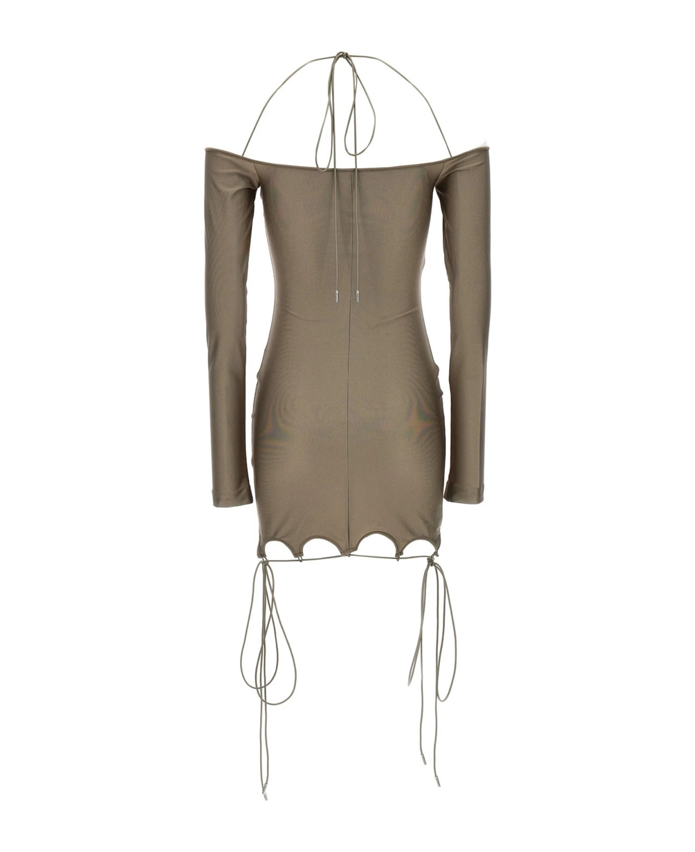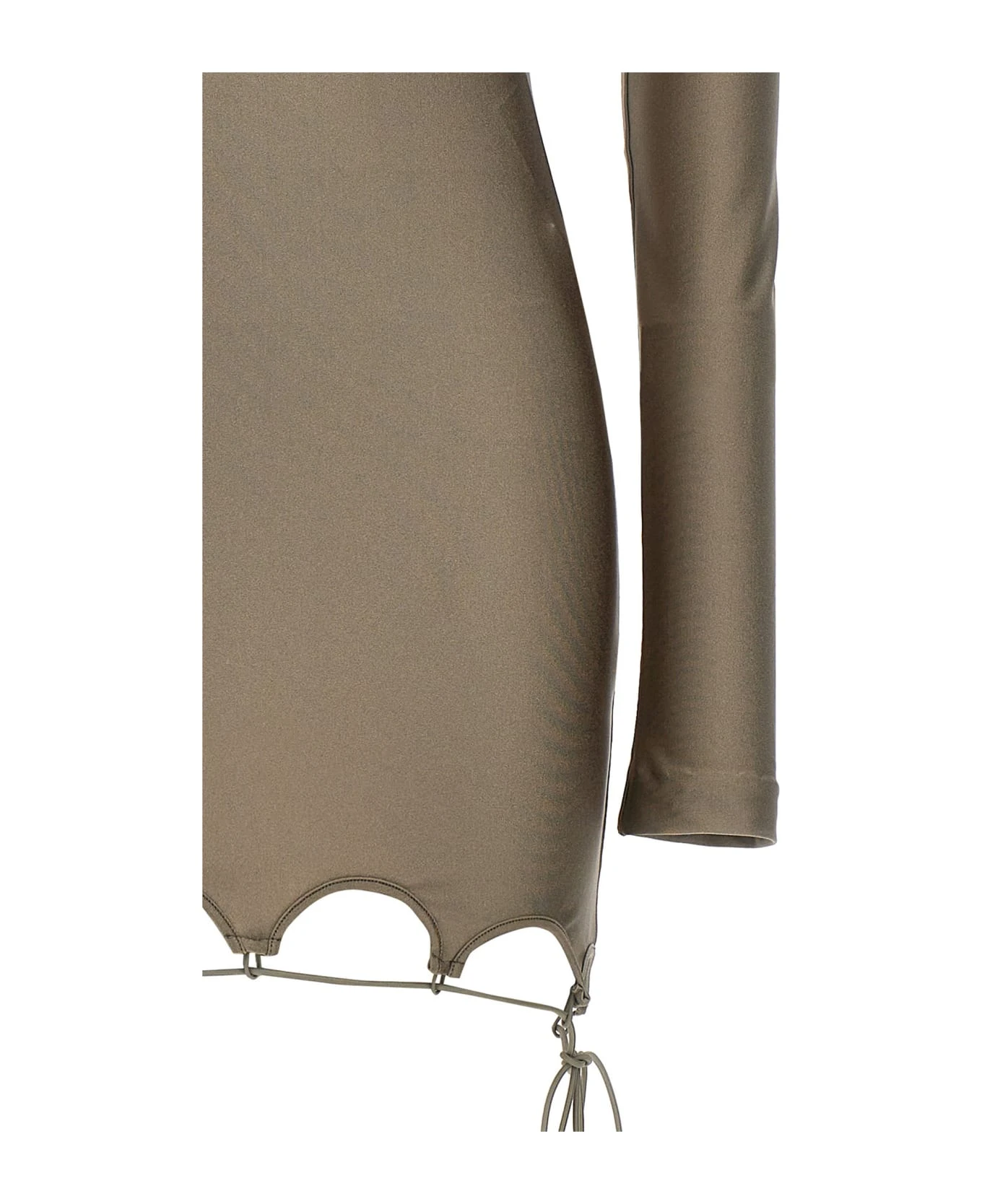 Lyna’ shiny military lycra dress with flared neckline and hem and metal logo final.