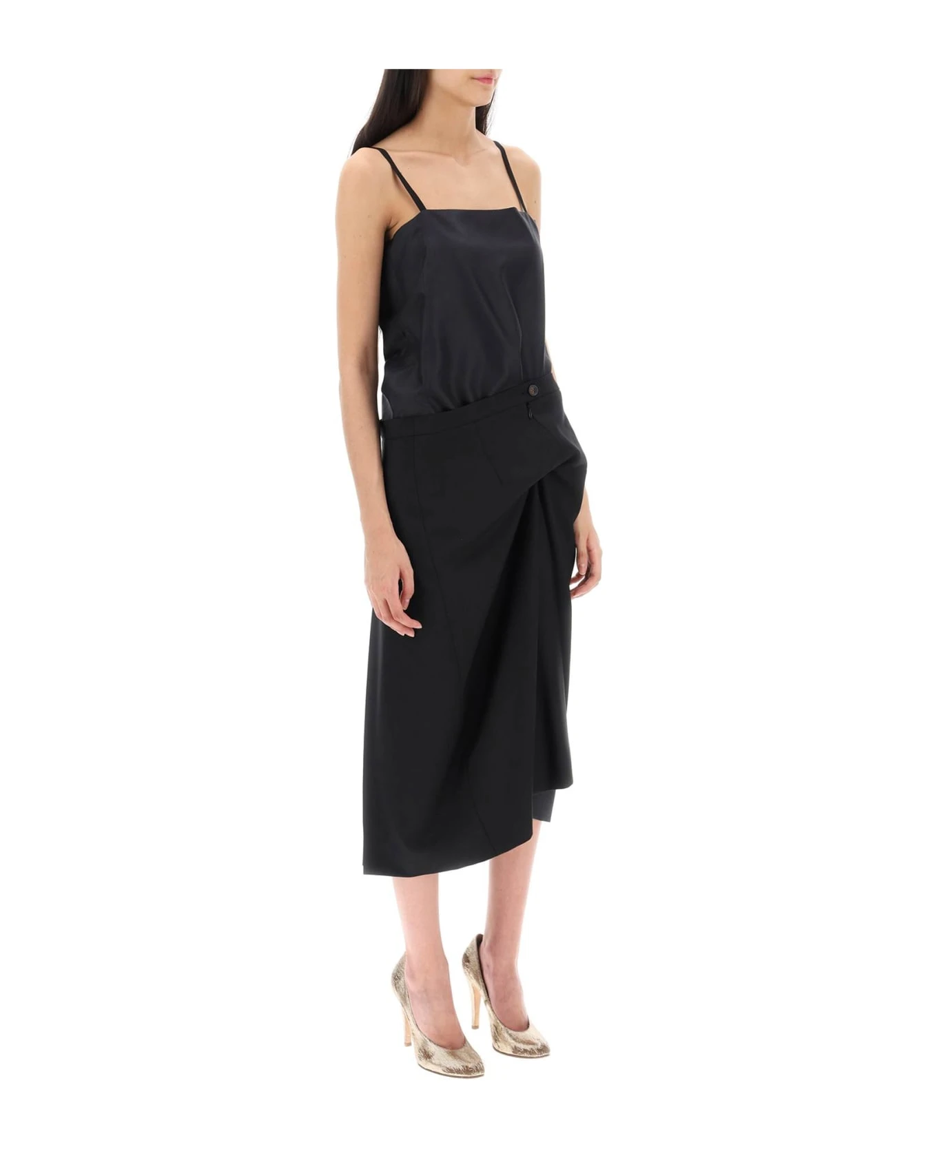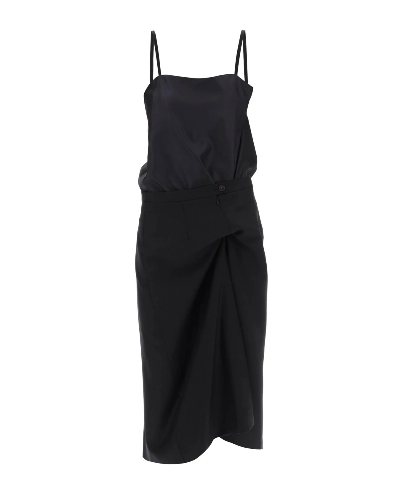 Maison Margiela midi dress inspired by the ‘Anonymity of the lining’ concept characterized by a dual material construction with a silk twill bodice and a ruched pleated skirt in wool barathea. It features thin straps and front zipper and button fastening. Embellished with contrasting signature stitching on the back. Lined interior. Relaxed fit. The model is 177 cm tal and wears size IT 40.