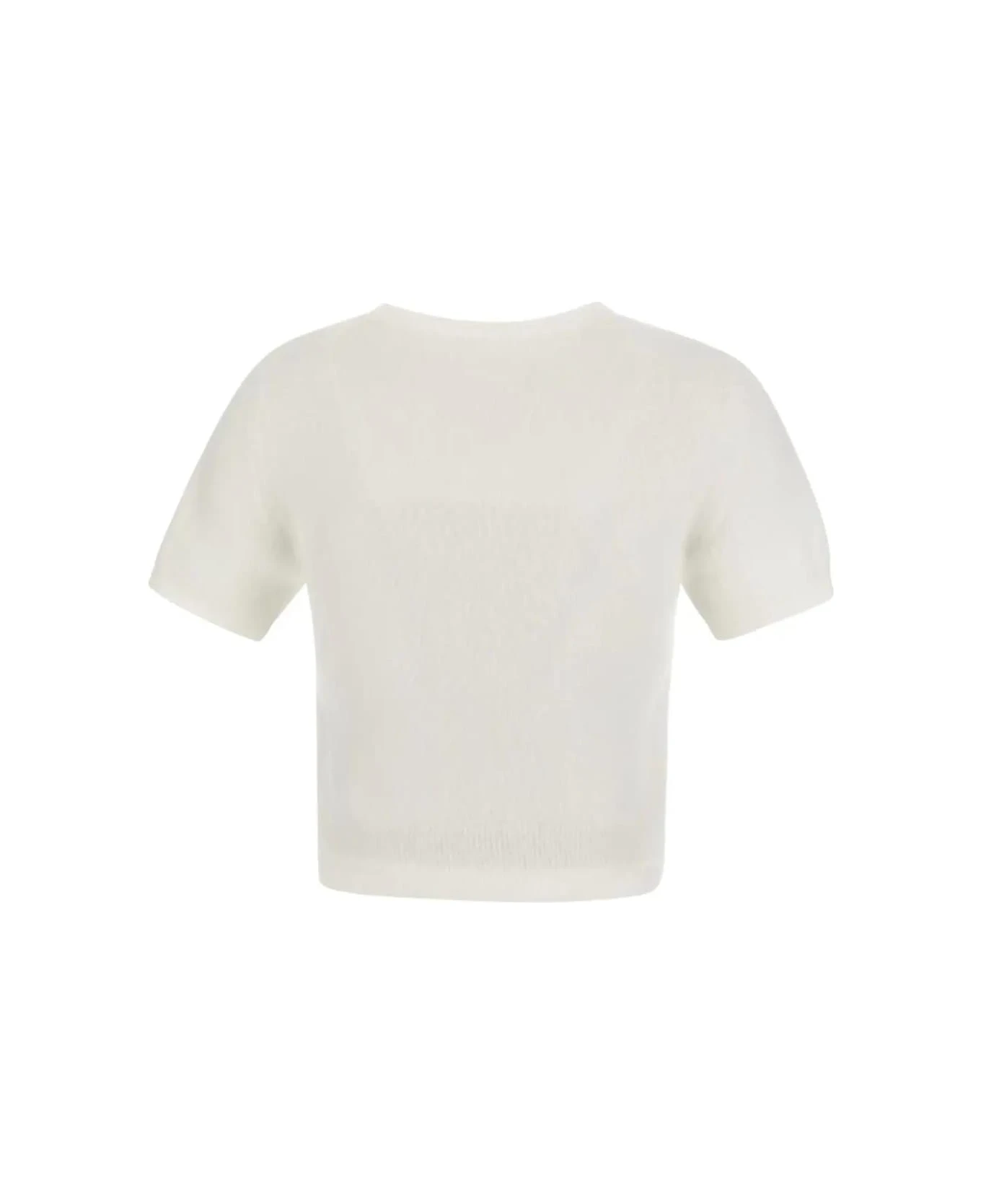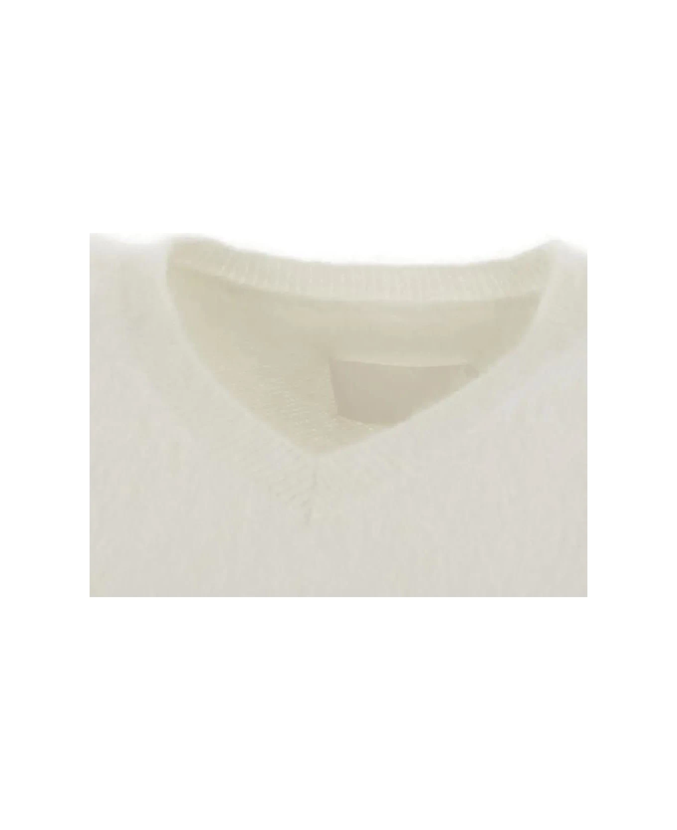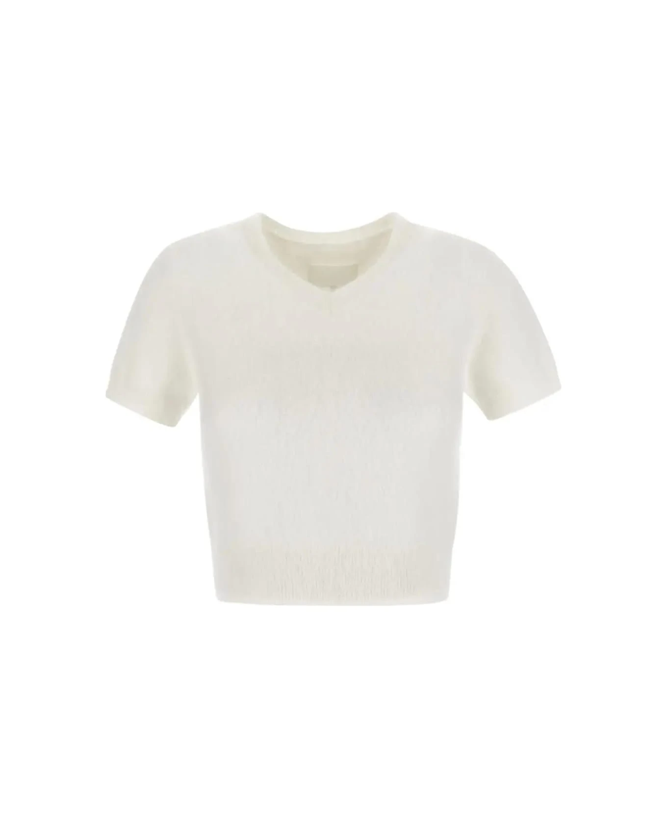 Maison Margiela knit cropped top in white angora blend with short sleeves, a V-neck, ribbed hems and regular fit.