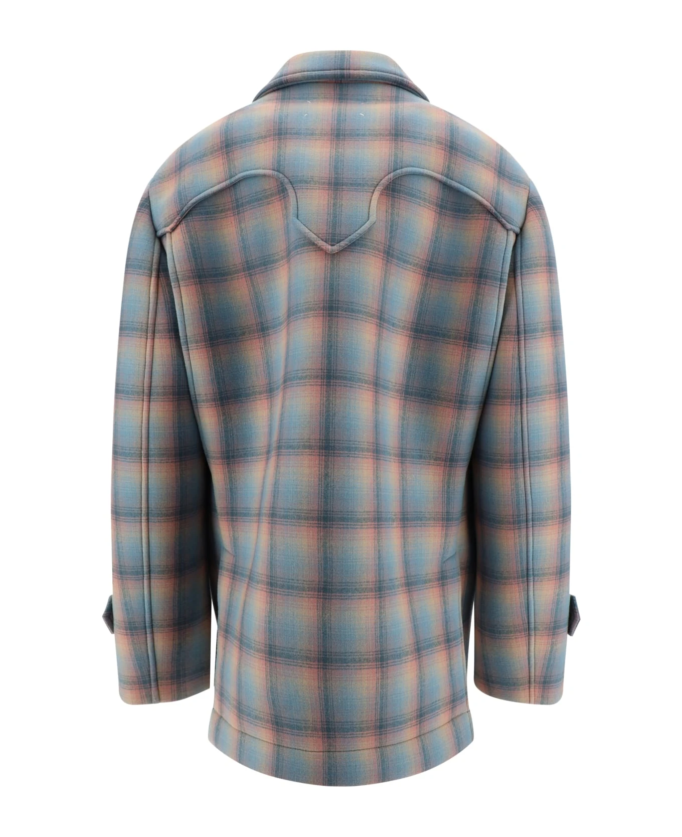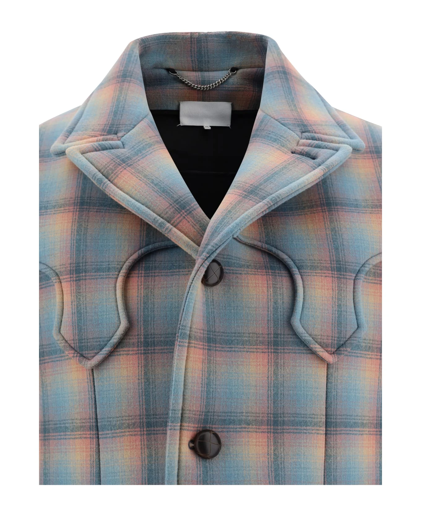 Fleece wool kaban coat by margiela, front button fastening, classic lapels, two side welt pockets with flap for closure, multi-coloured tartan pattern, adjustable cuffs, contrasting embroidered fabric patch on sleeve, oversize fit.