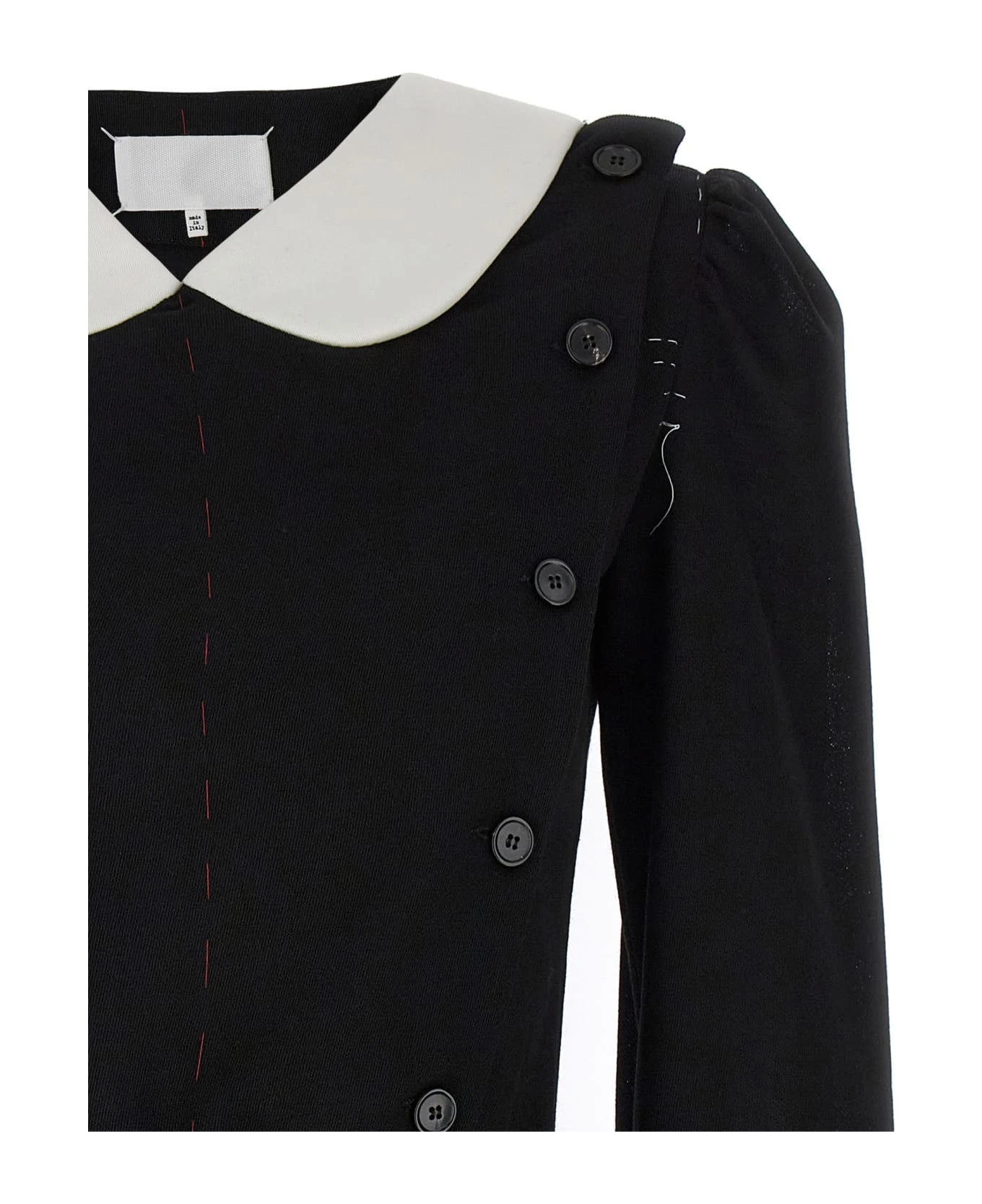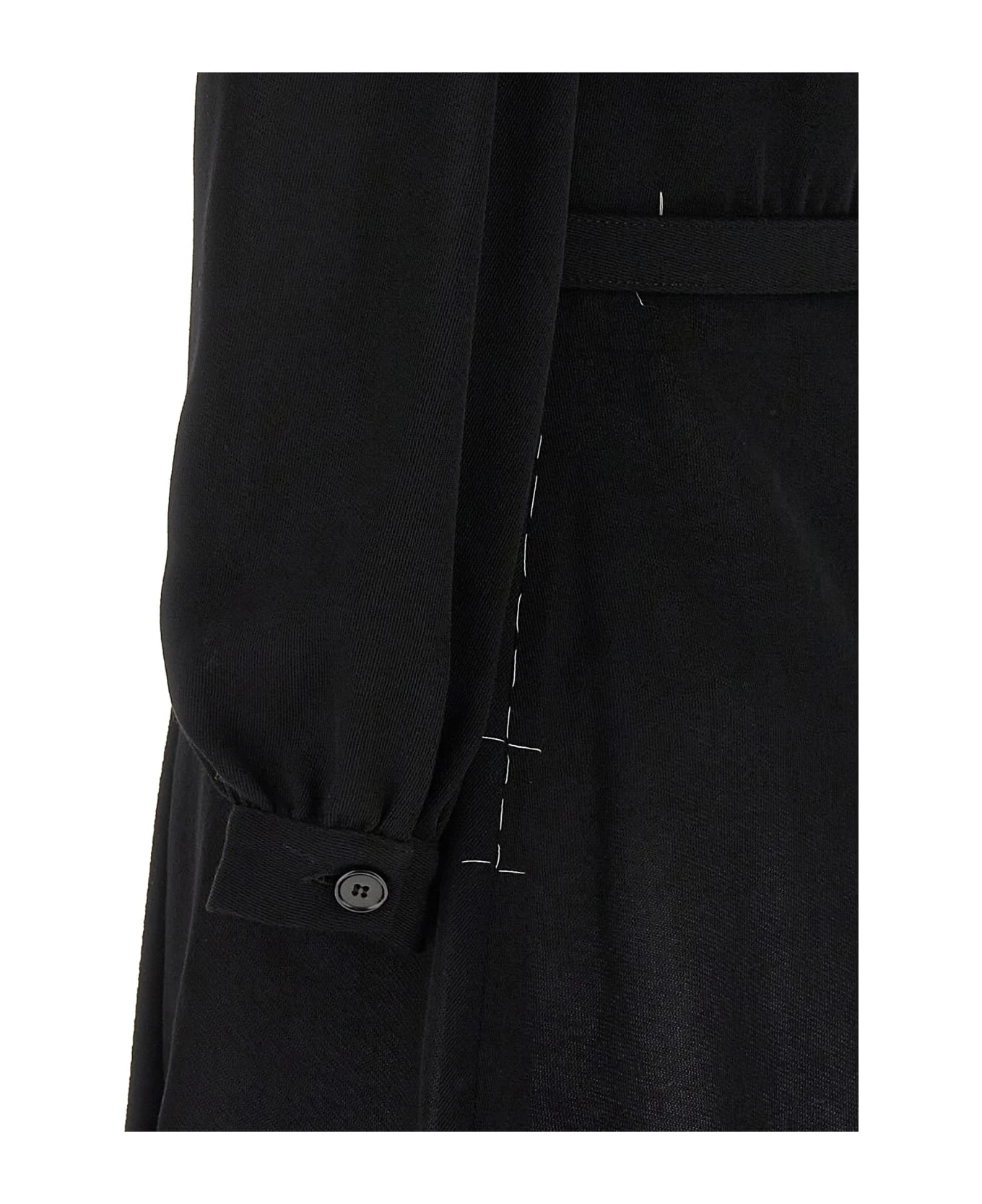 Wool dress with unfinished effect stitching, contrasting collar, long cuffed sleeves, adjustable waist belt.