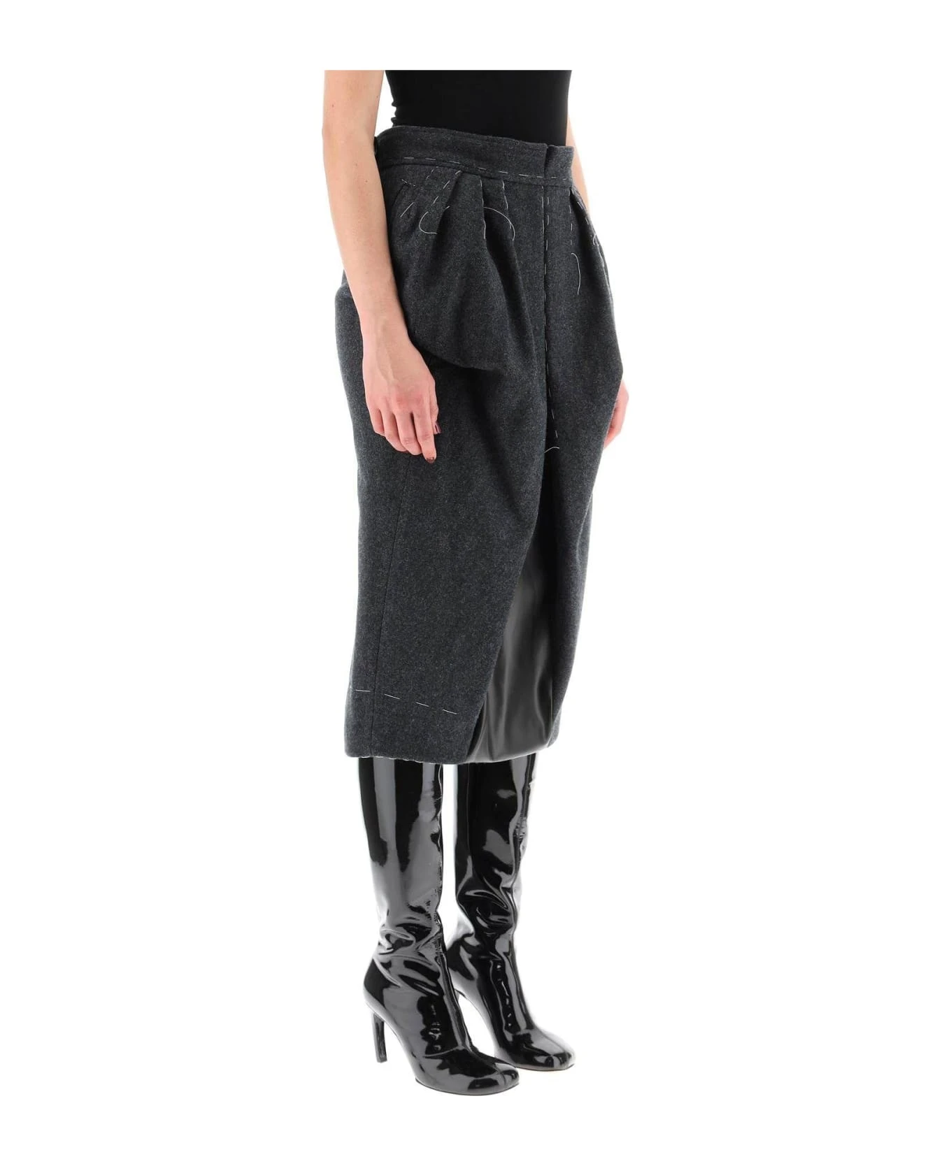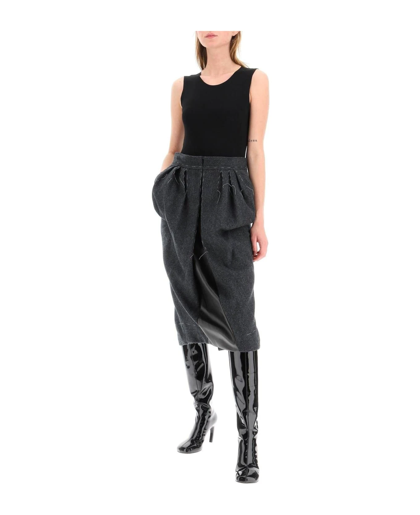 Maison Margiela midi skirt in herringbone melange wool, enhanced by a unique puffed front sculpted by pleats, with a faux leather insert. It is finished with basted-effect stitching and provided with side welt pockets, back vent, lined interior and back invisible zip closure. The model is 177 cm tall and wears a size IT 40.