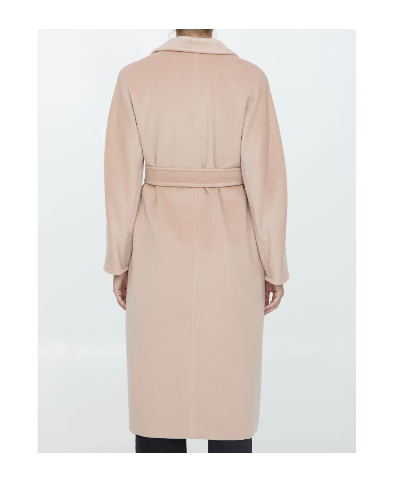 Madame coat in powder pink virgin wool and cashmere. It features peaked lapels, front double-breasted closure, detachable belt at wait and two side welt pockets. Regular fit.