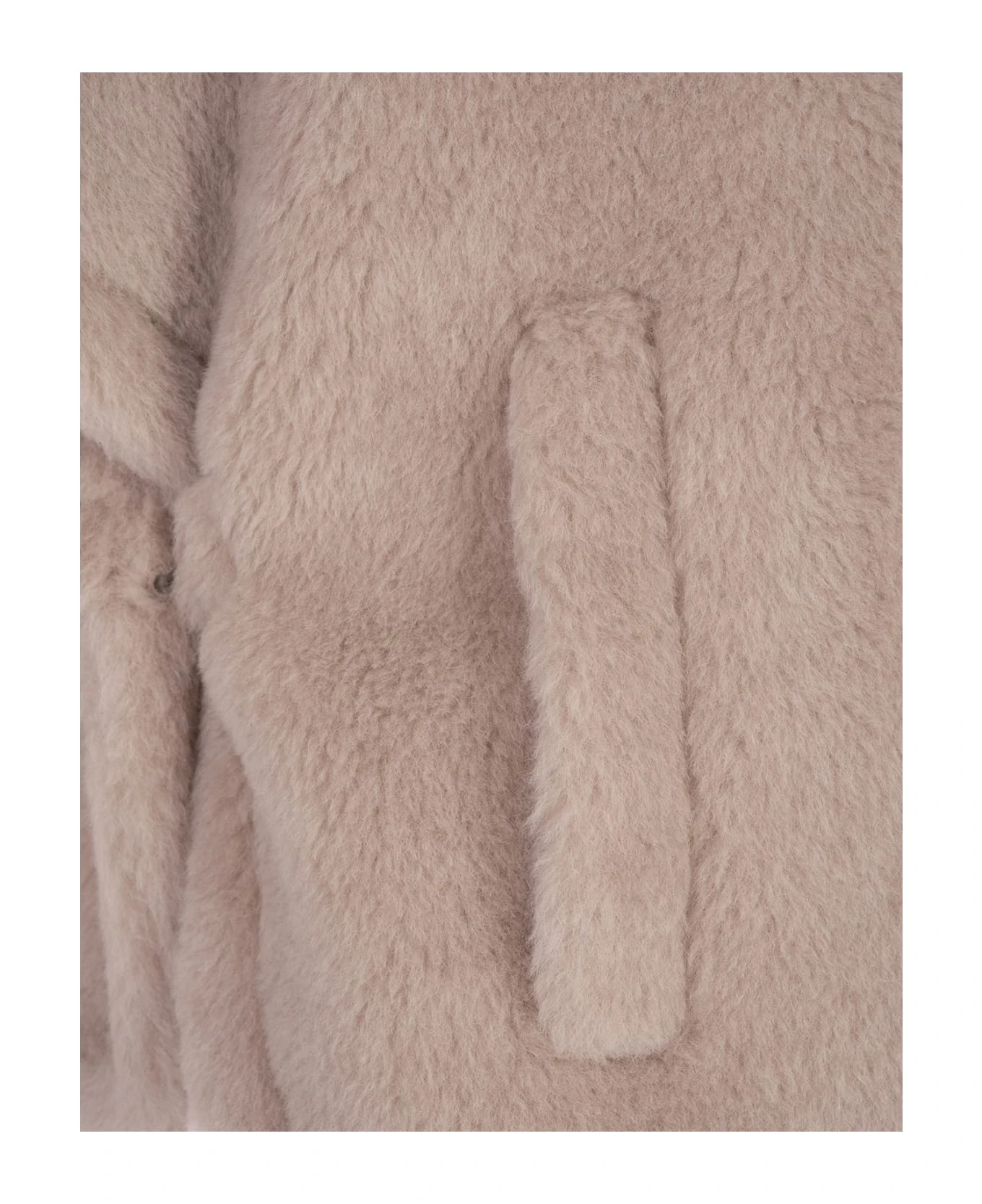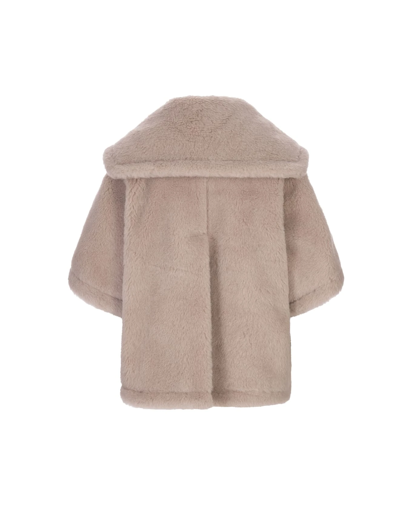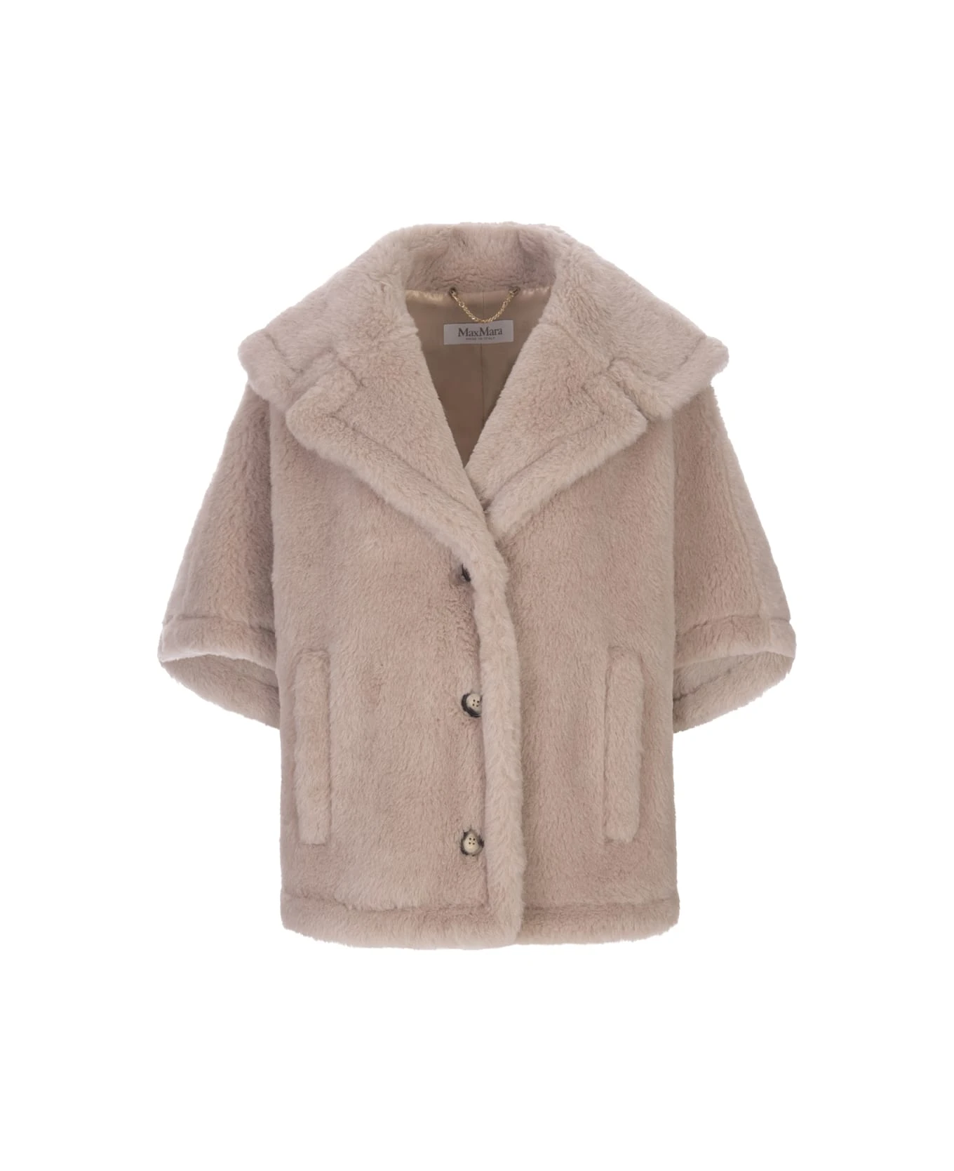 Sand-colored Cambusa1 coat by Max Mara made of soft Teddy fabric of alpaca and wool on a silk base. Wide, enveloping volume features maxi back slit, wide, marinier-inspired lapel collar, short sleeves, and vertical welt pockets. Satin lining. Asymmetrical single-breasted button closure.