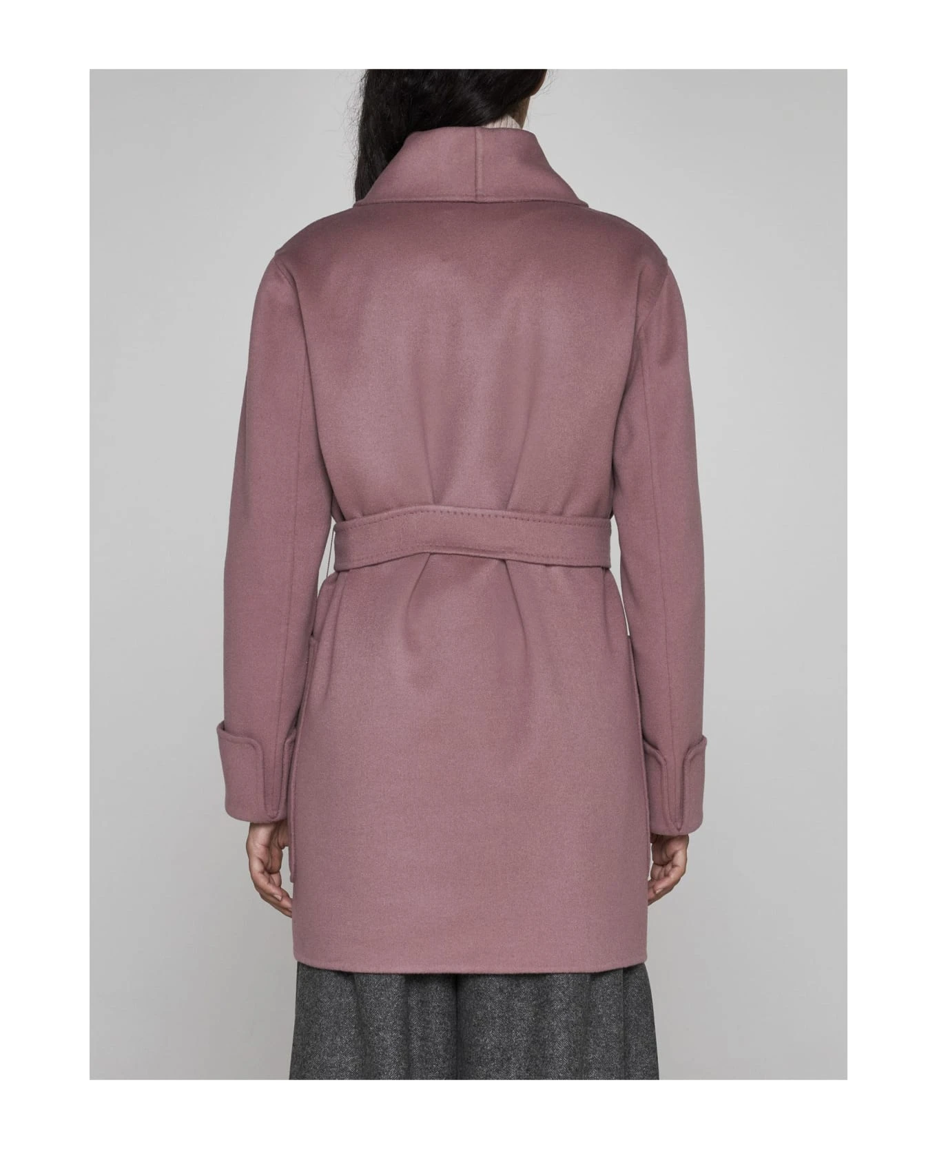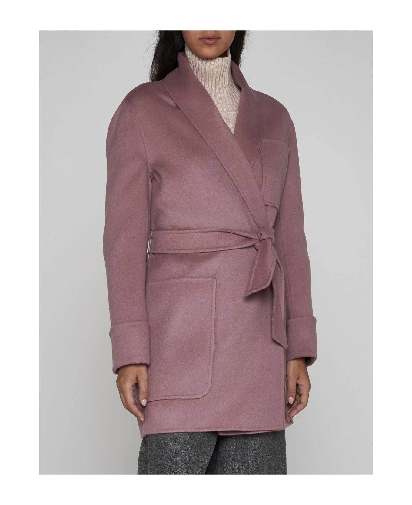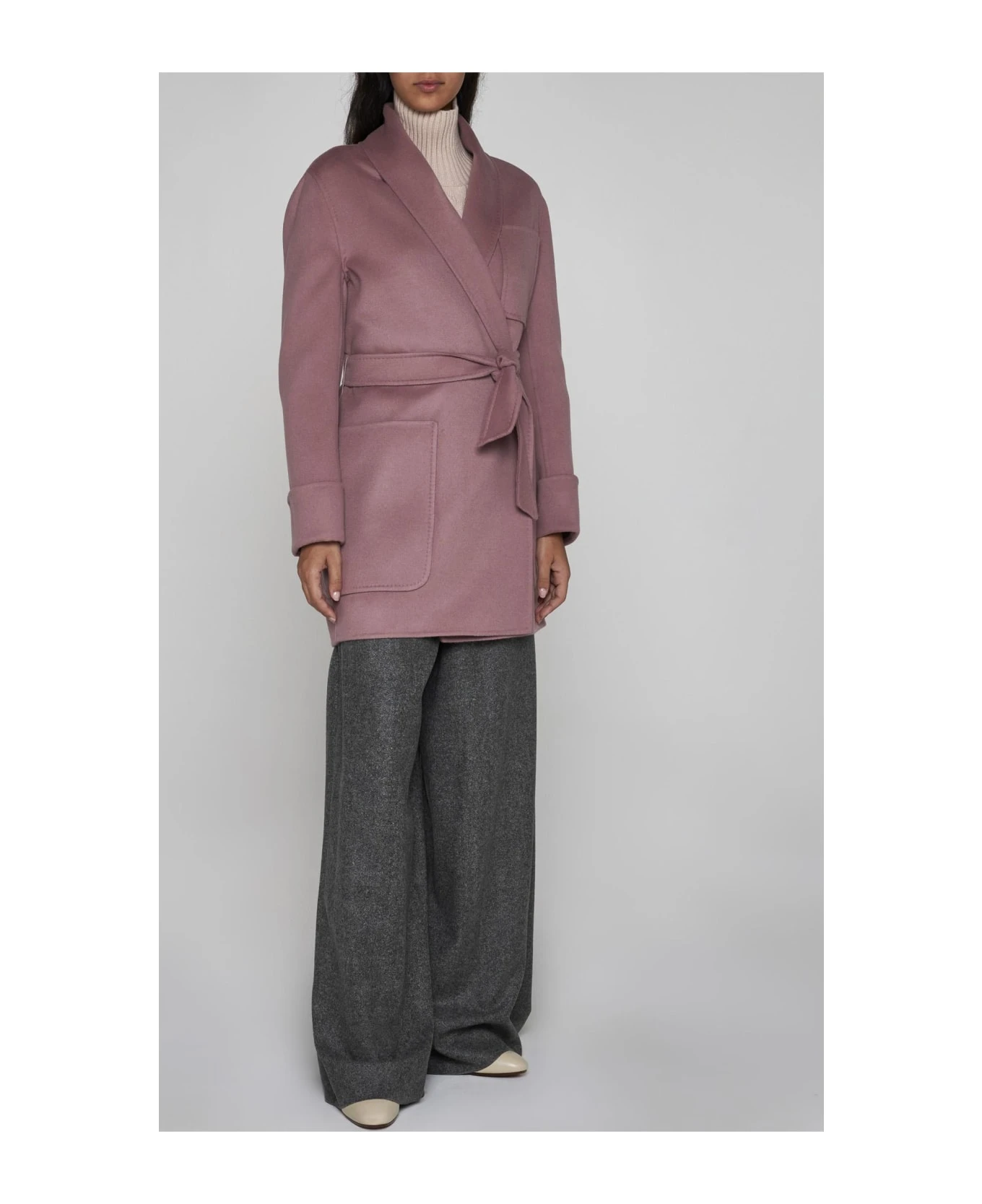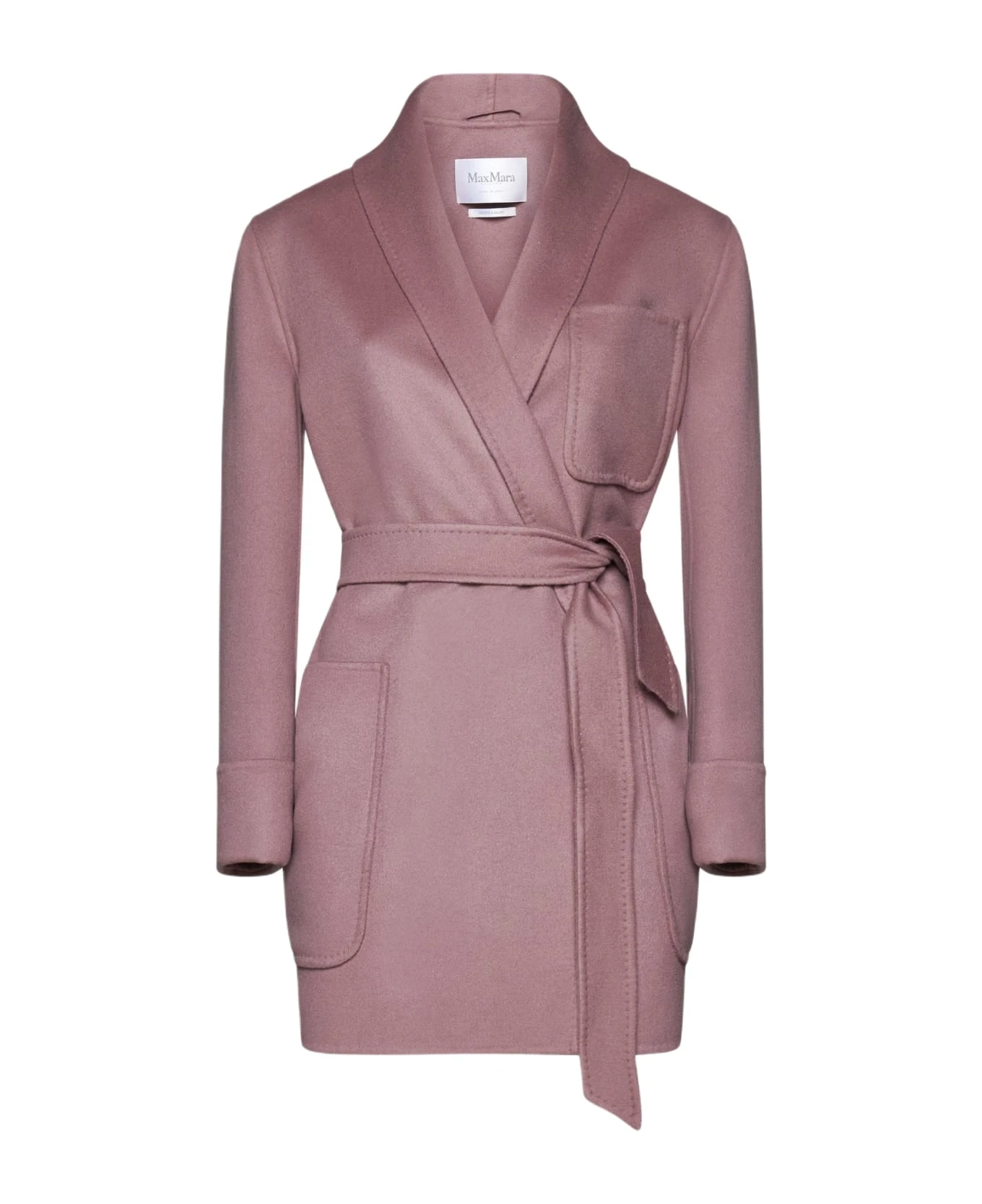 Max Mara’s Ughetta pink wool and silk blend jacket featuring shawl lapels, chest pocket, self-tie waist belt, front patch pockets and cuffs with turn-ups.