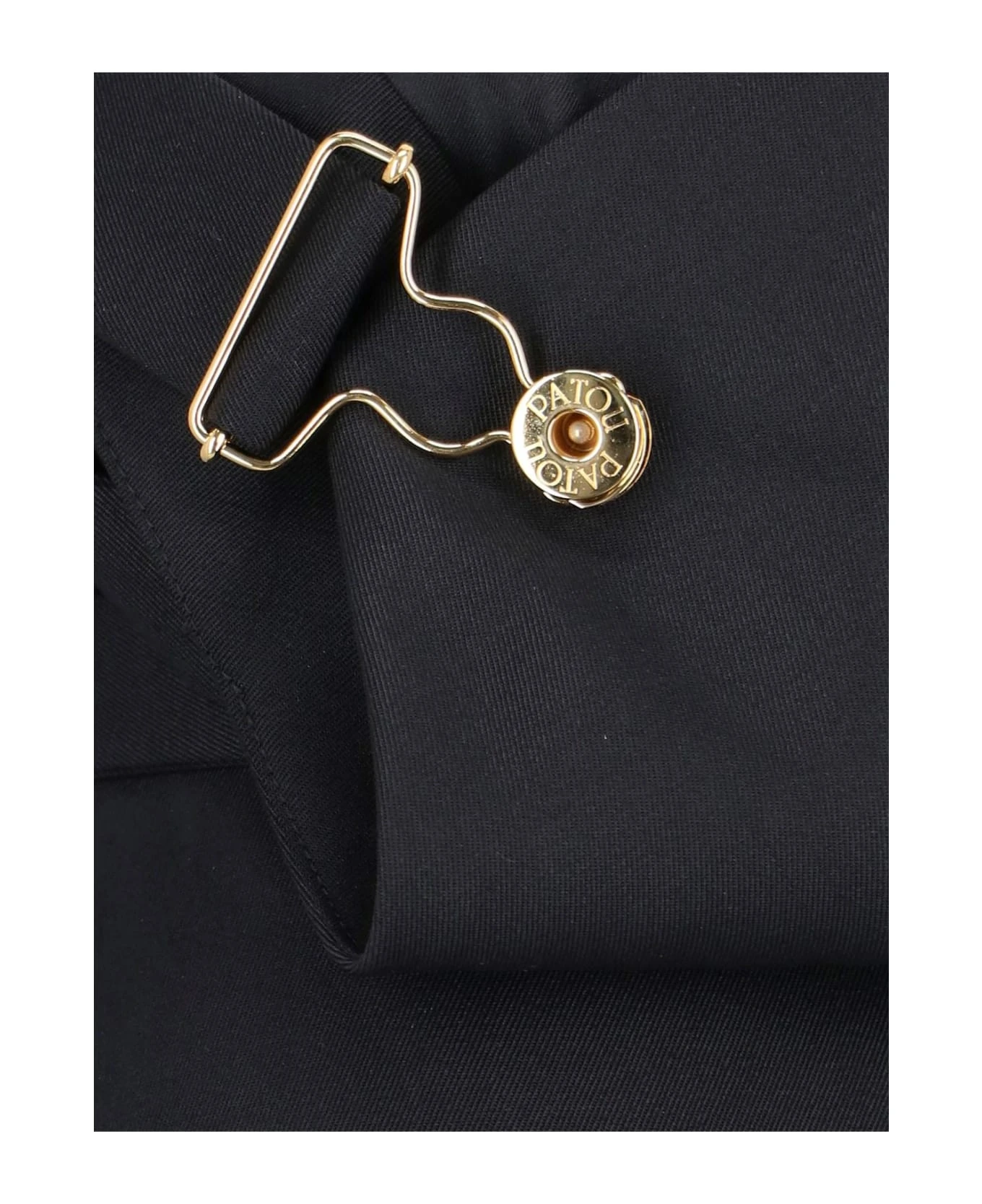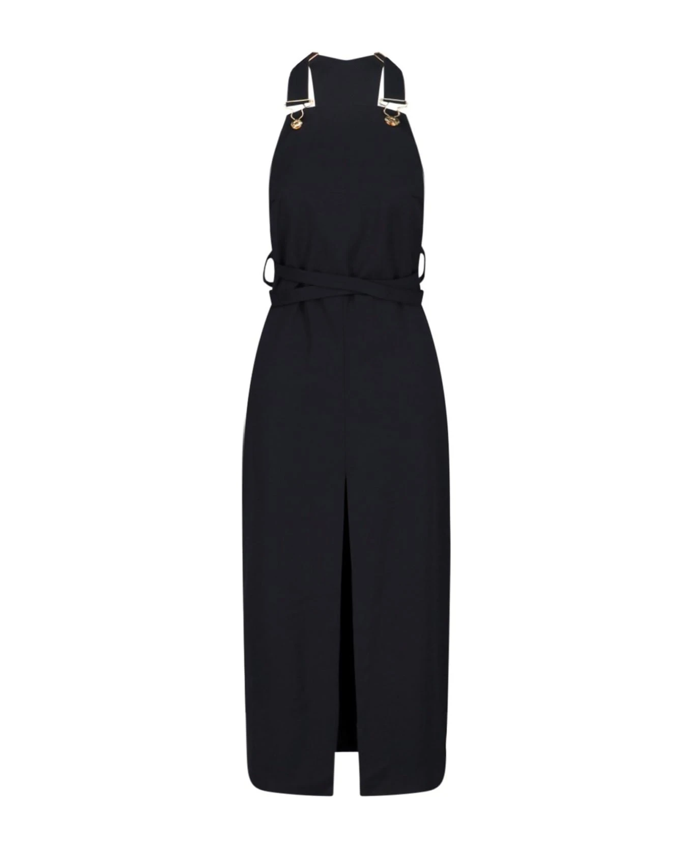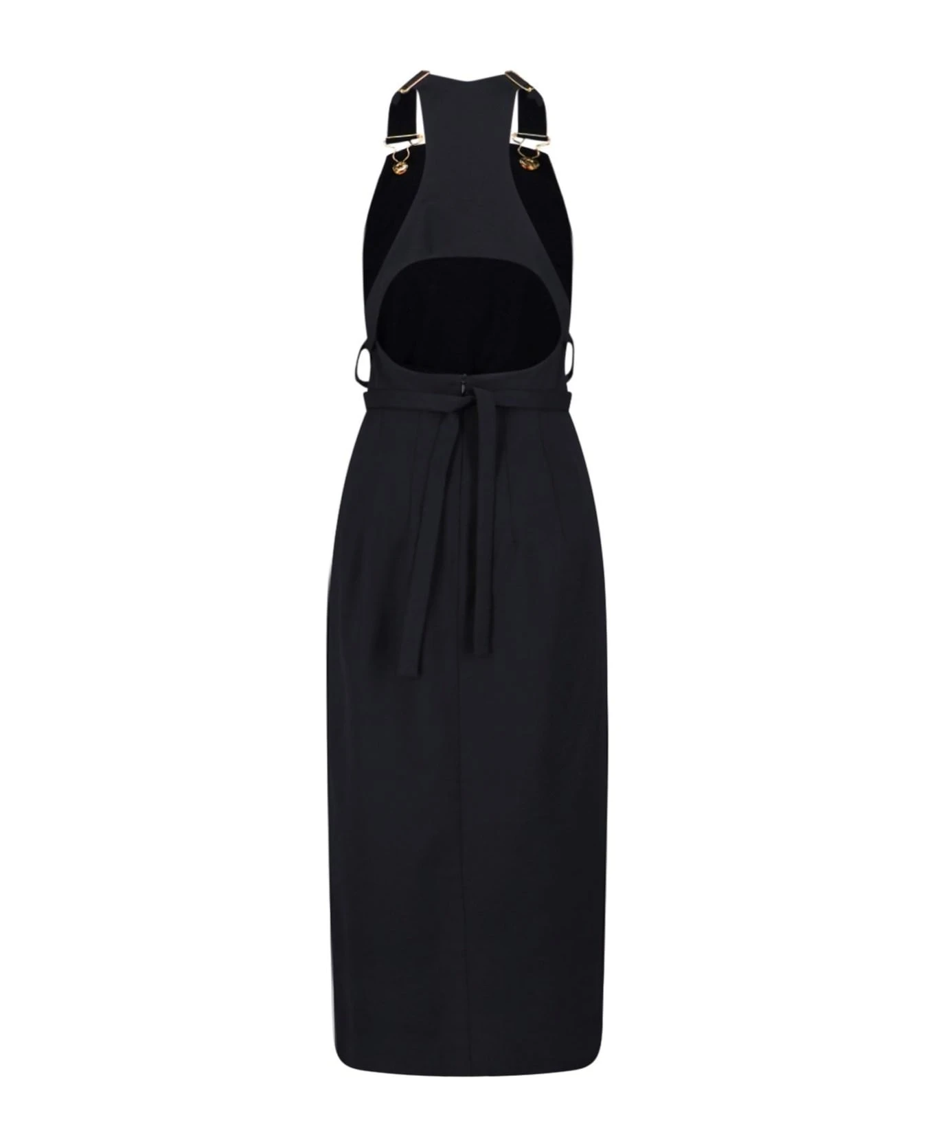 Patou midi dungarees dress in black virgin wool with adjustable straps, gold metal details, belt loops, adjustable laces at the waist, front center split, back cut-out detail, back zip closure, straight hem.