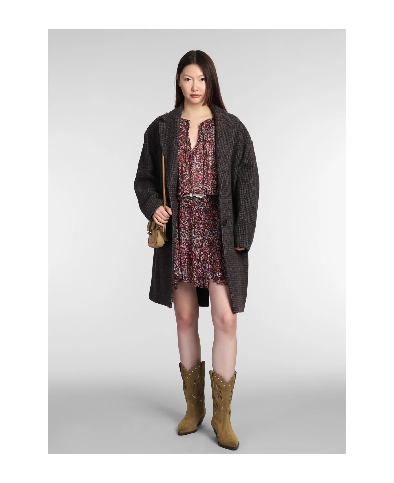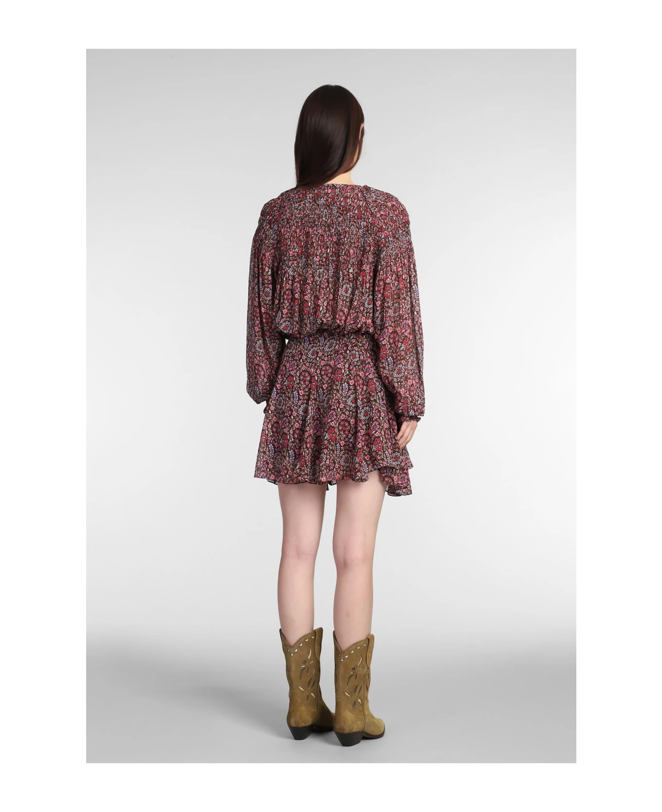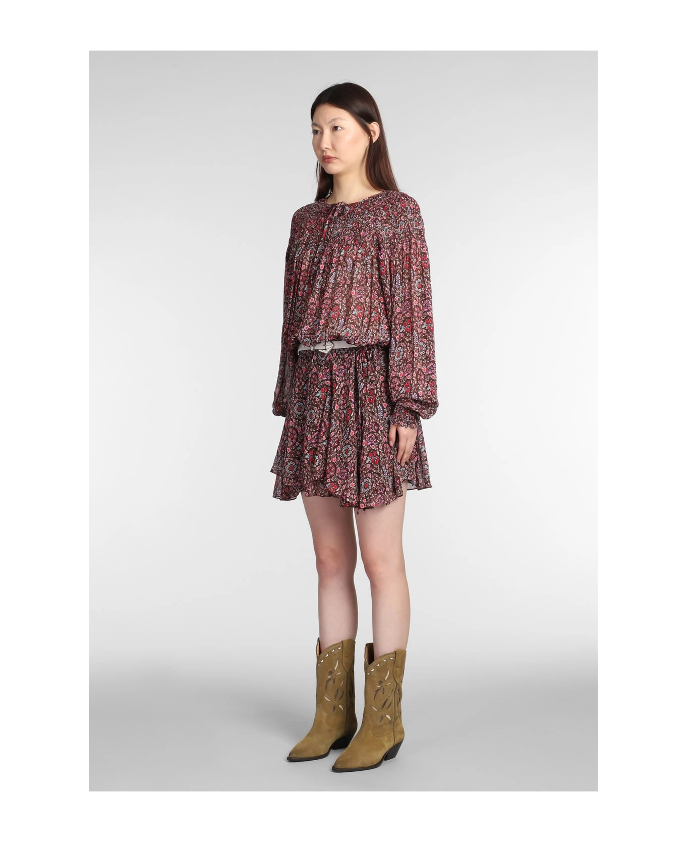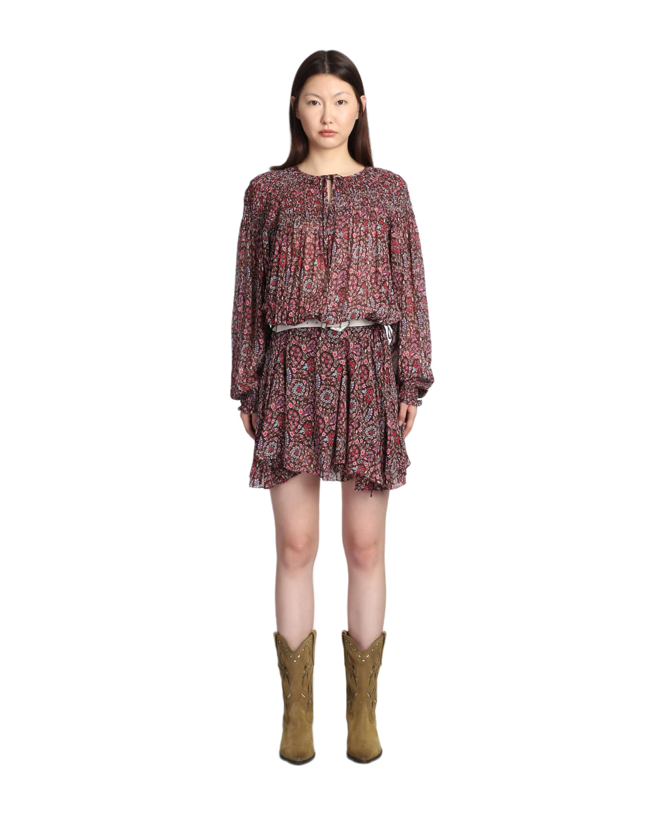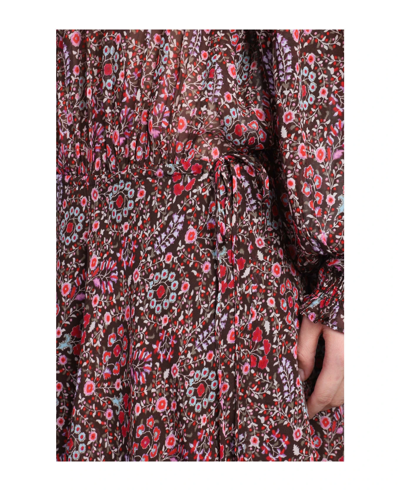 Noanne Dress in brown viscose, tie neck, long sleeves, gathered detailing, floral print, Made in India, Model is 1. 77 cm and wear size 38