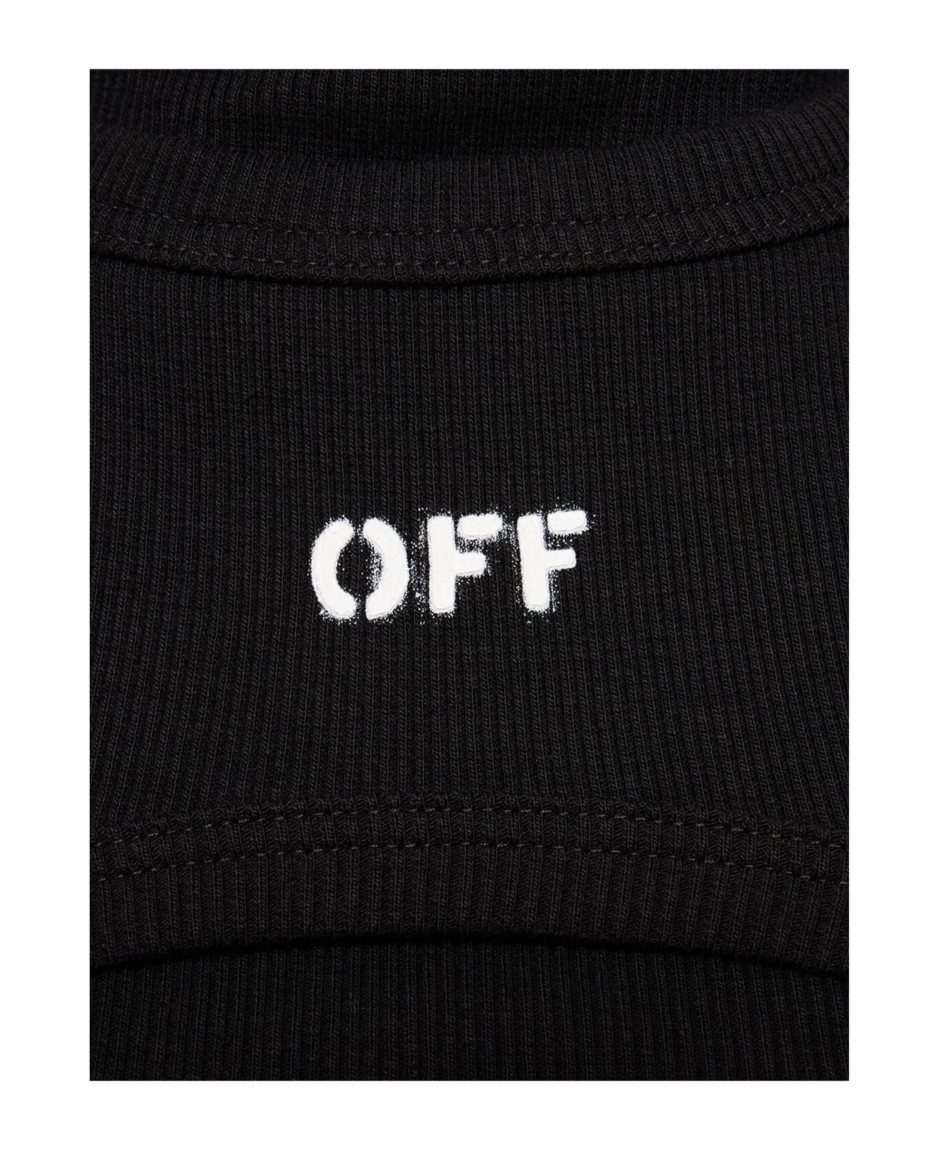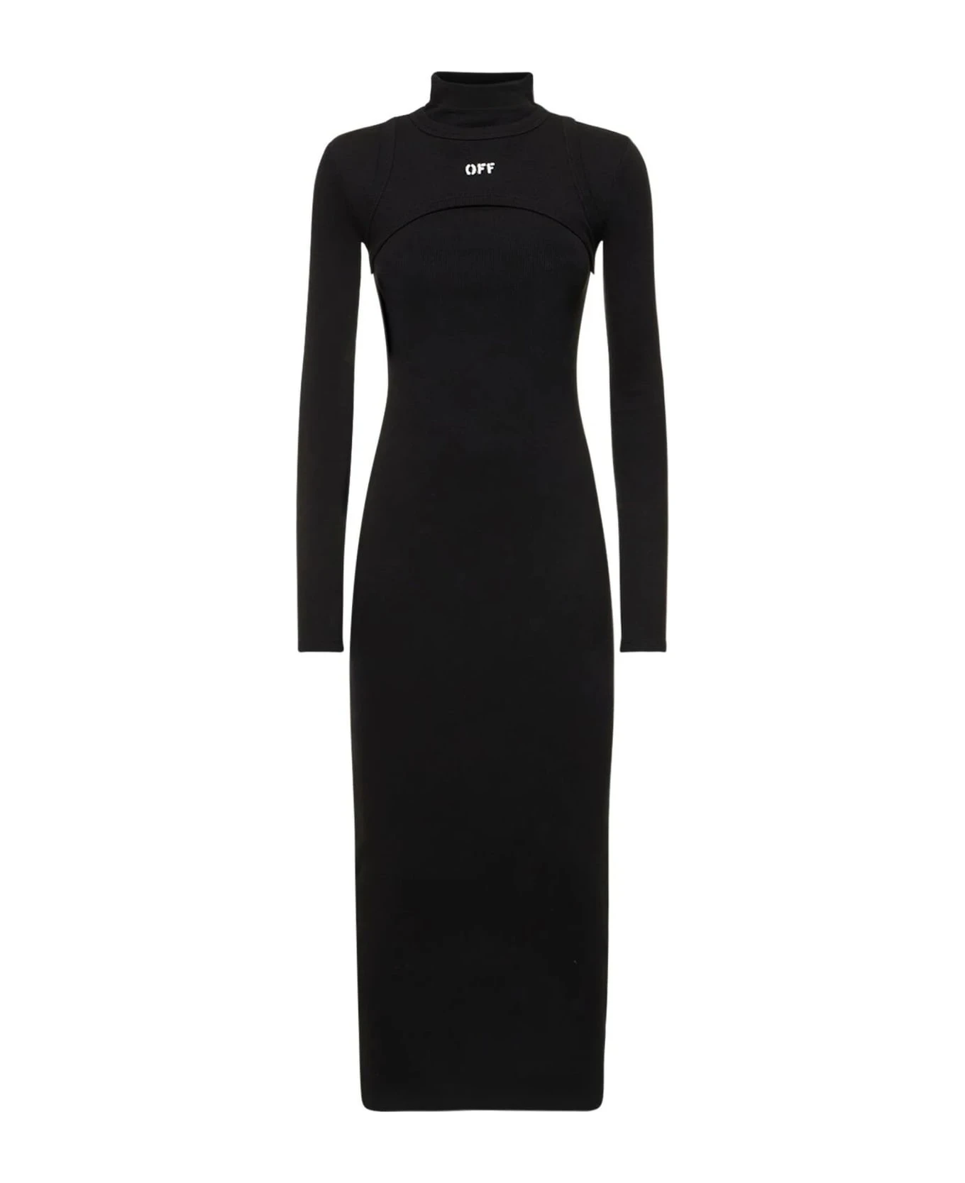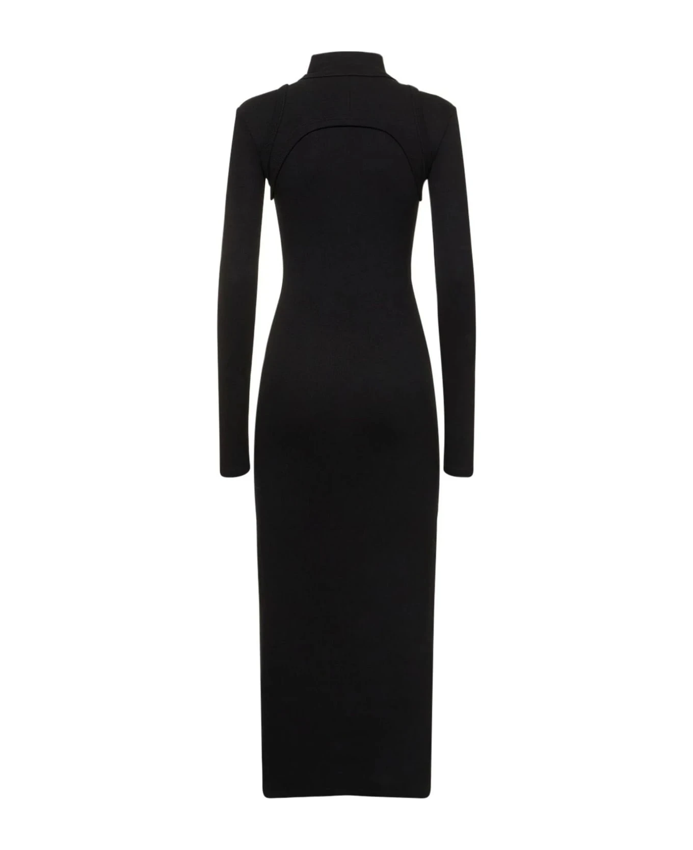 Black stretch-cotton midi dress, fine ribbed, double layer, embroidered logo at the chest, high neck, long sleeves, straight hem, mid-length