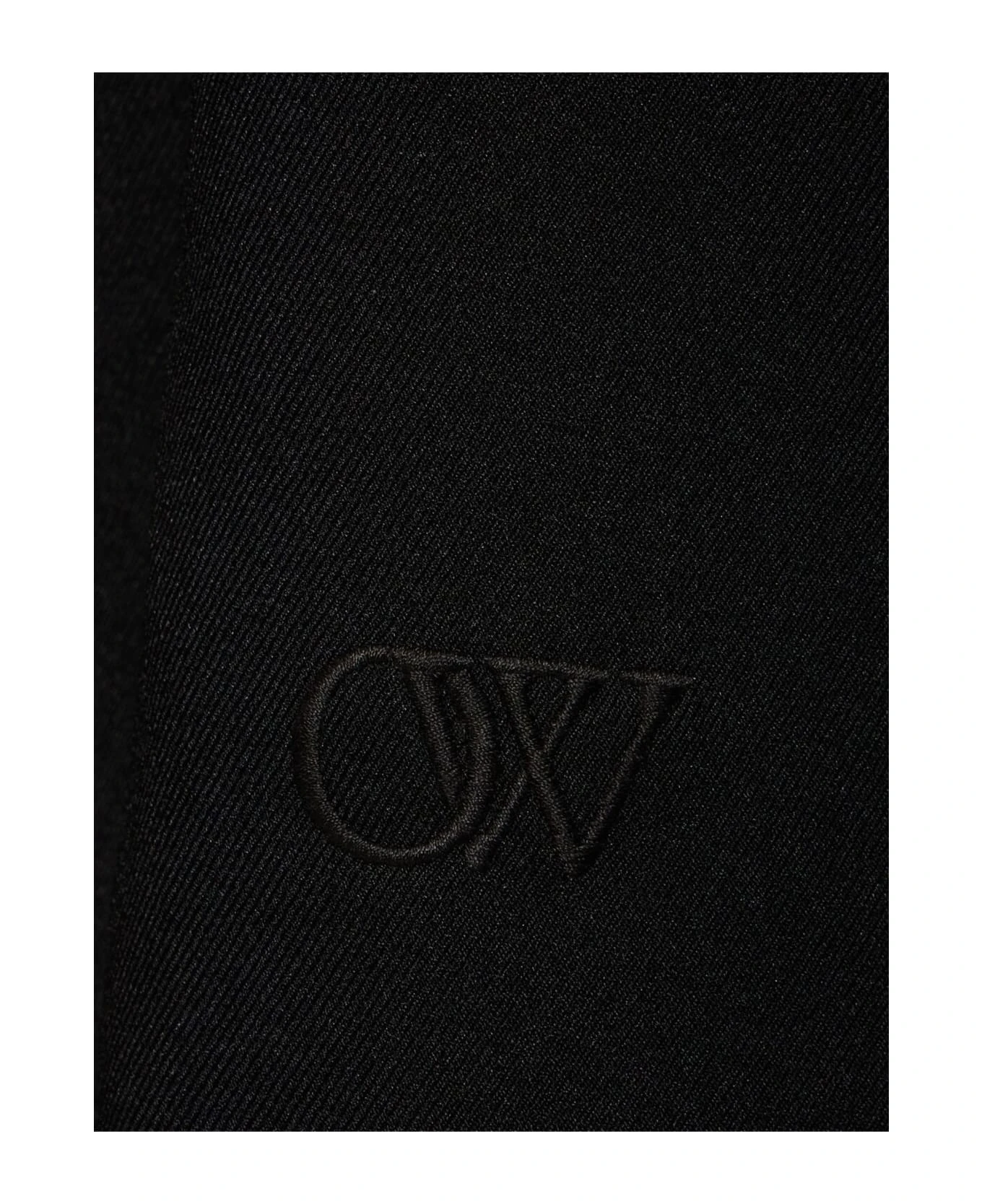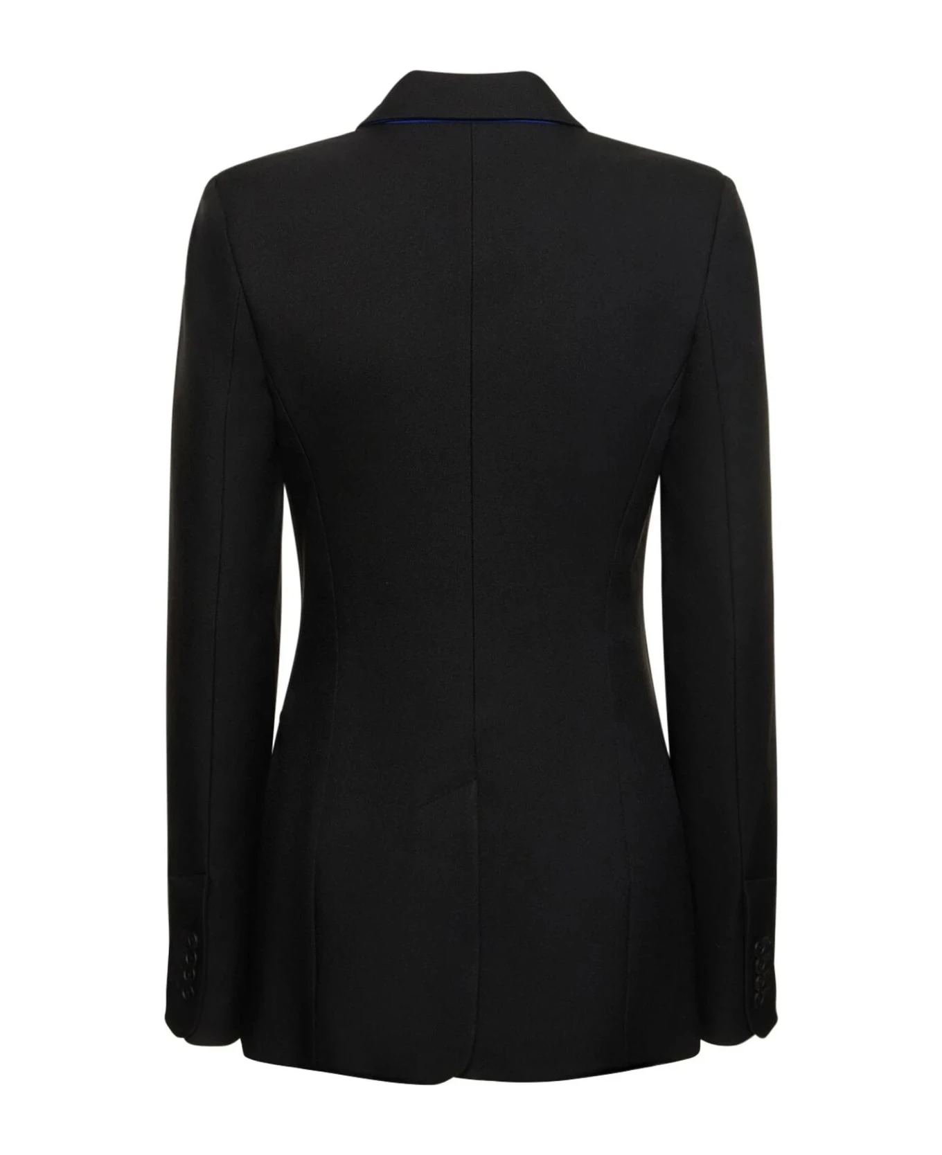 Black techno drill blazer, slogan print to the rear, notched collar, front button fastening, long sleeves, rear slit, chest welt pocket, two side welt pockets