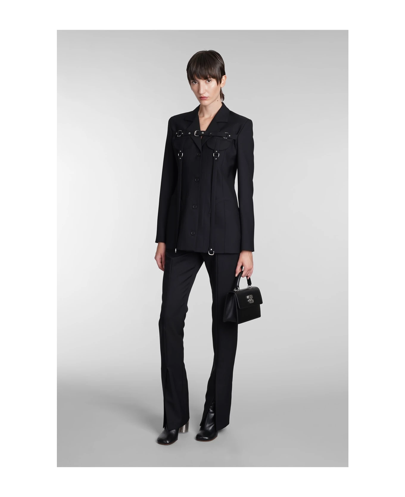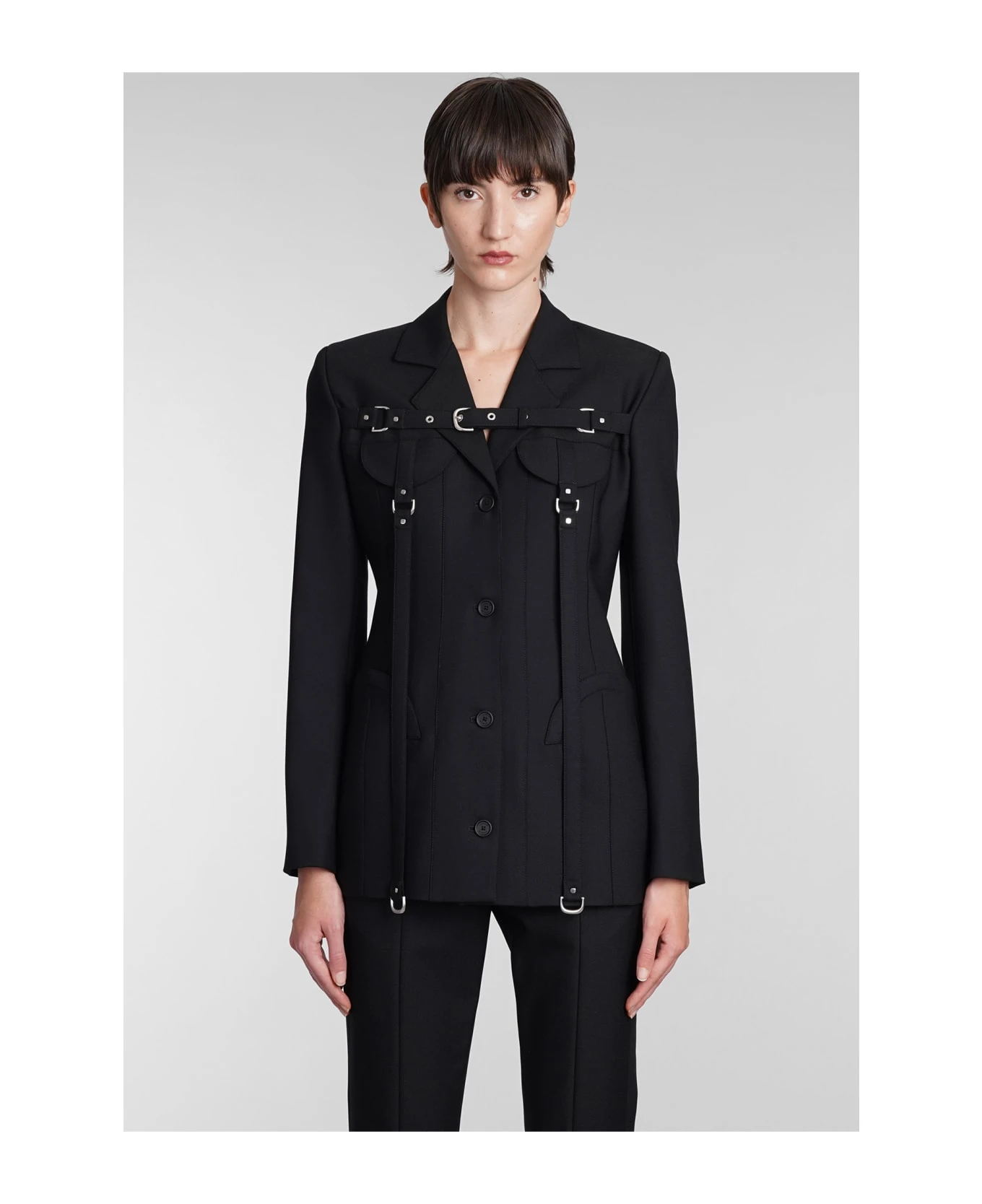 Blazer in black polyester, frontal buttoning, revers, long sleeves, buckle strap detail, 53% poliester, 43% wool, 4% elastan, Model is 180 cm and wears size 42, Made in Italy