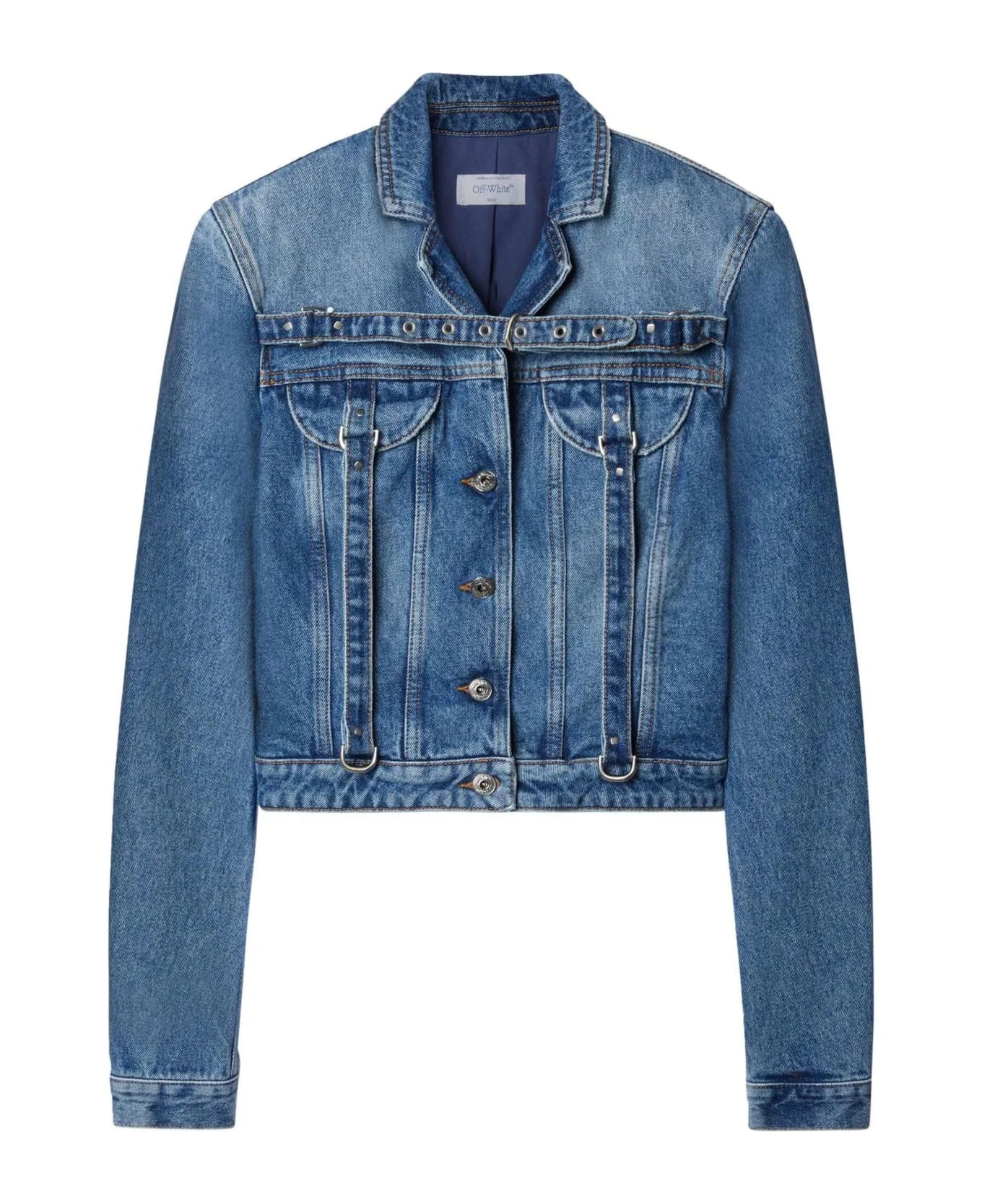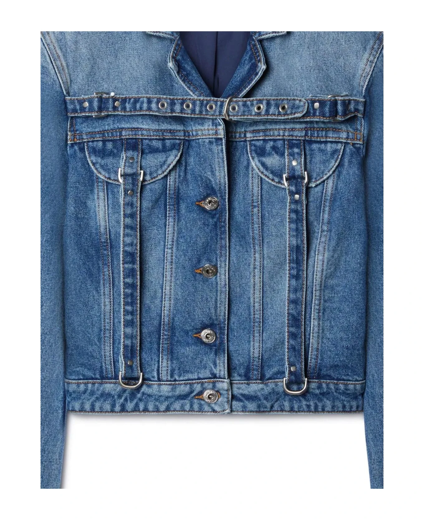 Blue cotton denim jacket, notched collar, belted chest, front button placket, long sleeves, buttoned cuffs, two chest belted flap pockets, straight hem