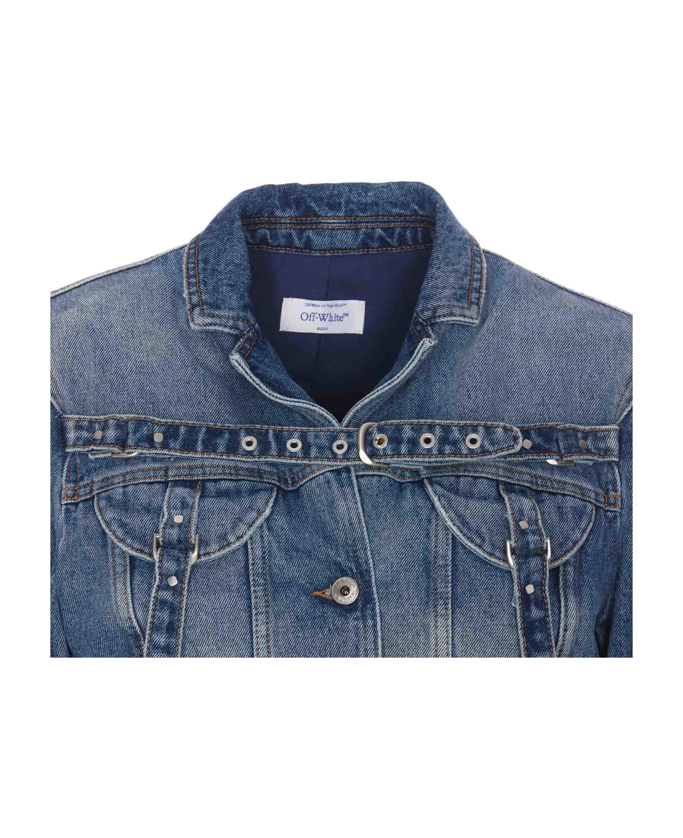 Off white denim Cargo crop denim jacket, frontal buttons closure, strap detail, long sleeves