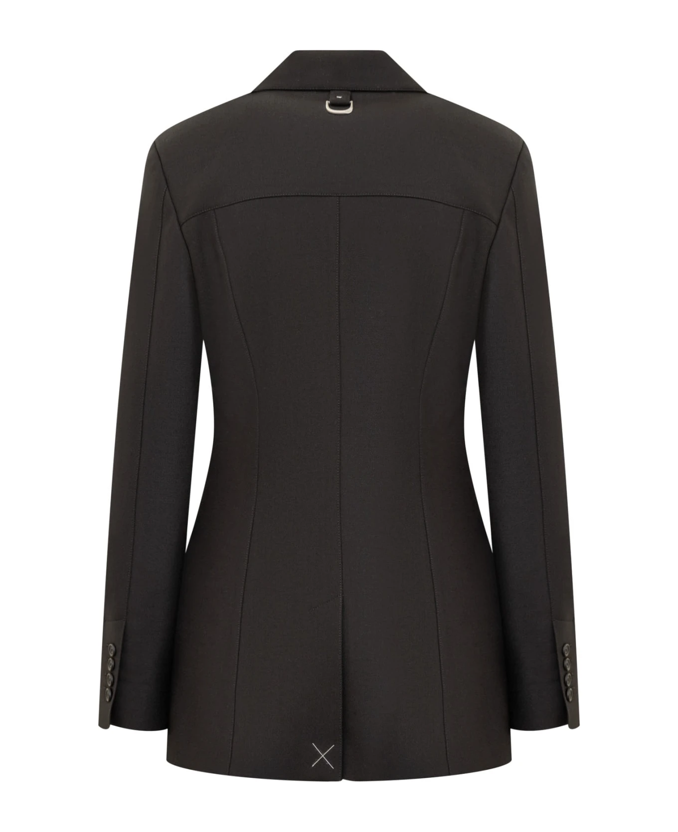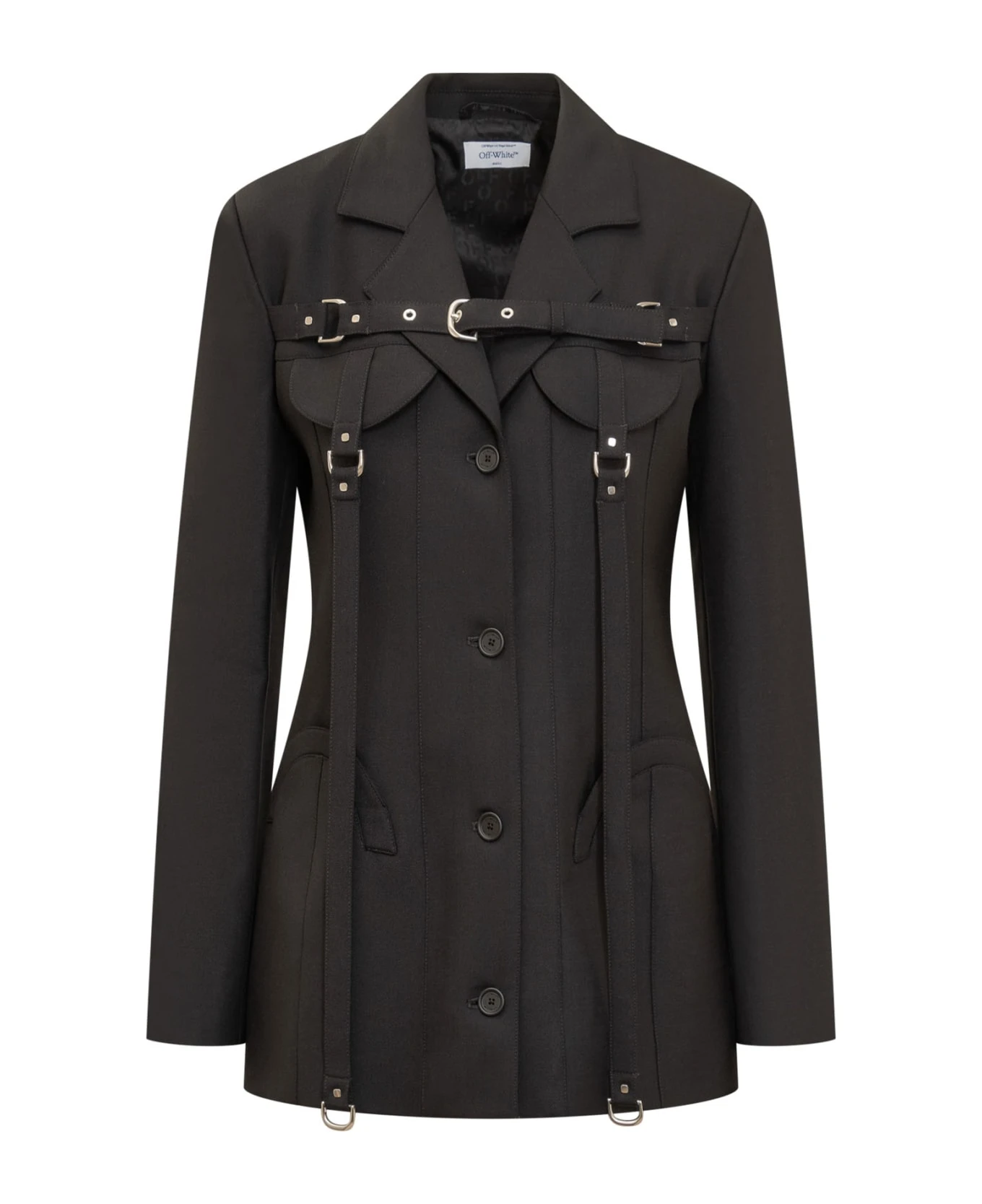 Long-sleeved jacket. V-neck. Classic collar. Button closure. Cuffs with buttons. Four pockets on front. Metal hook detail with all-over straps.