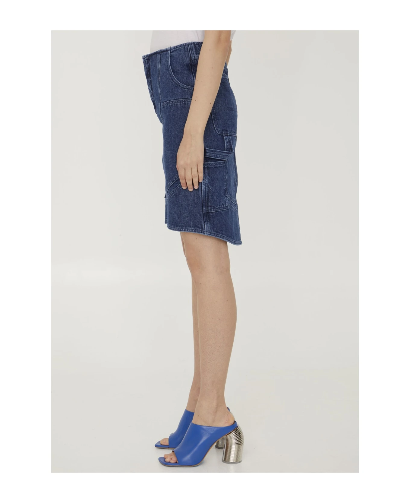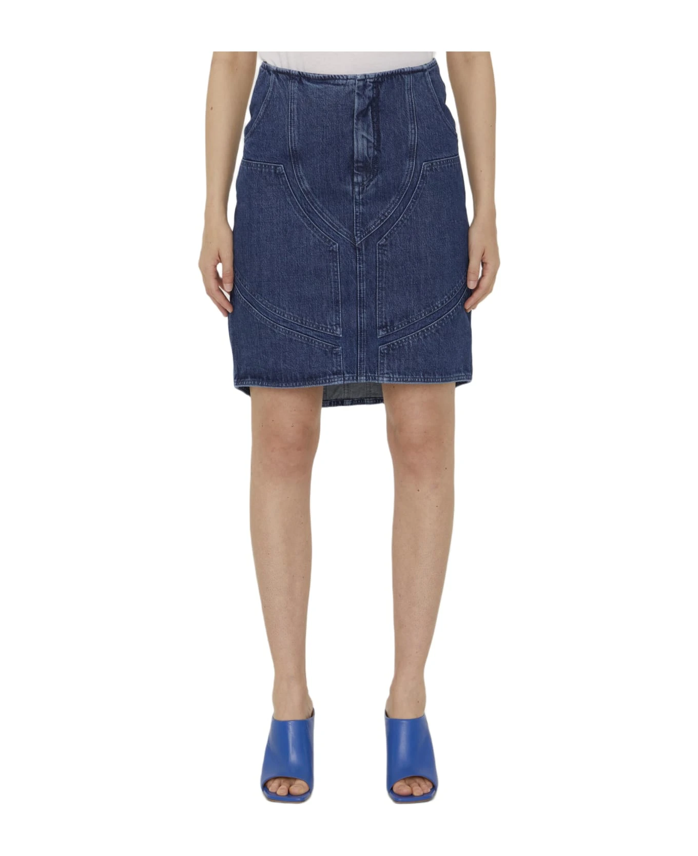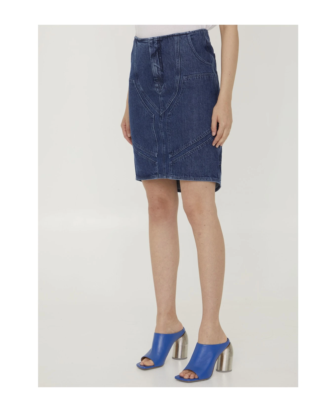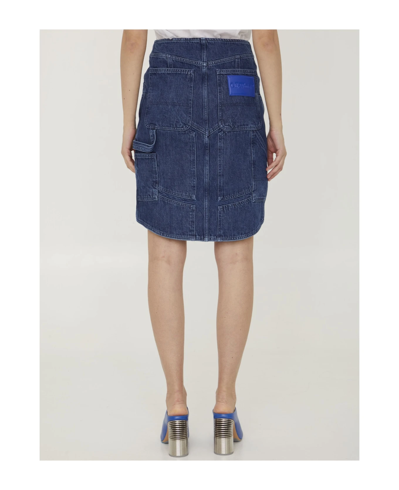 Motorcycle midi skirt in blue denim with visible stitching. It features zip and hook-and-eye closure, two side welt pockets, two rear patch pockets and two additional rear pockets. Off-White leather patch at the back.