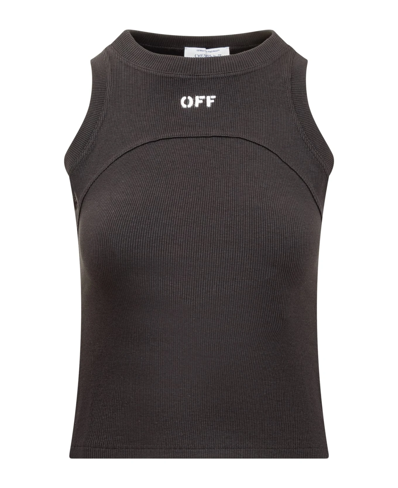 Sleeveless top. Crew neck. Stretch ribbed workmanship. Off logo printed on the front.