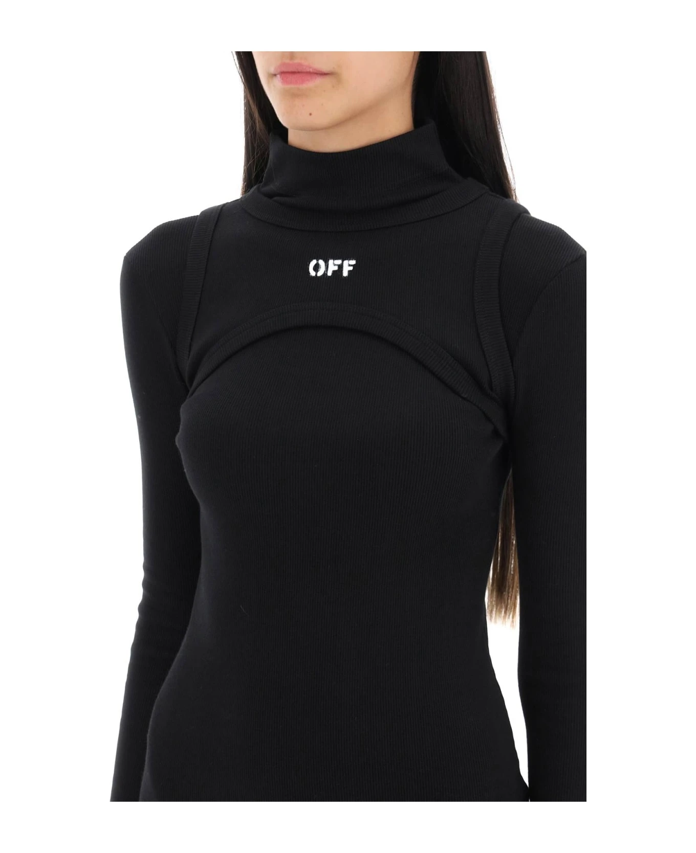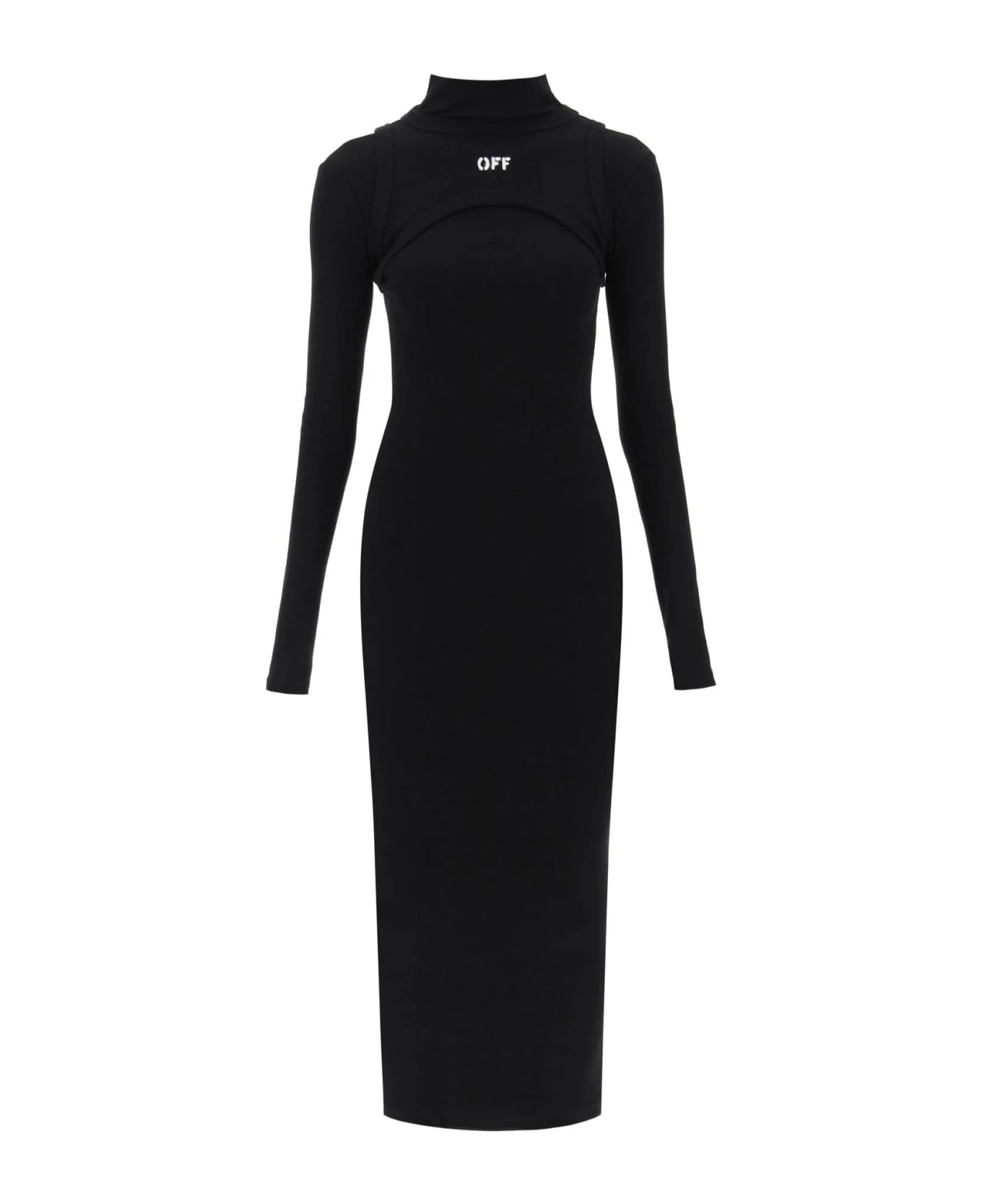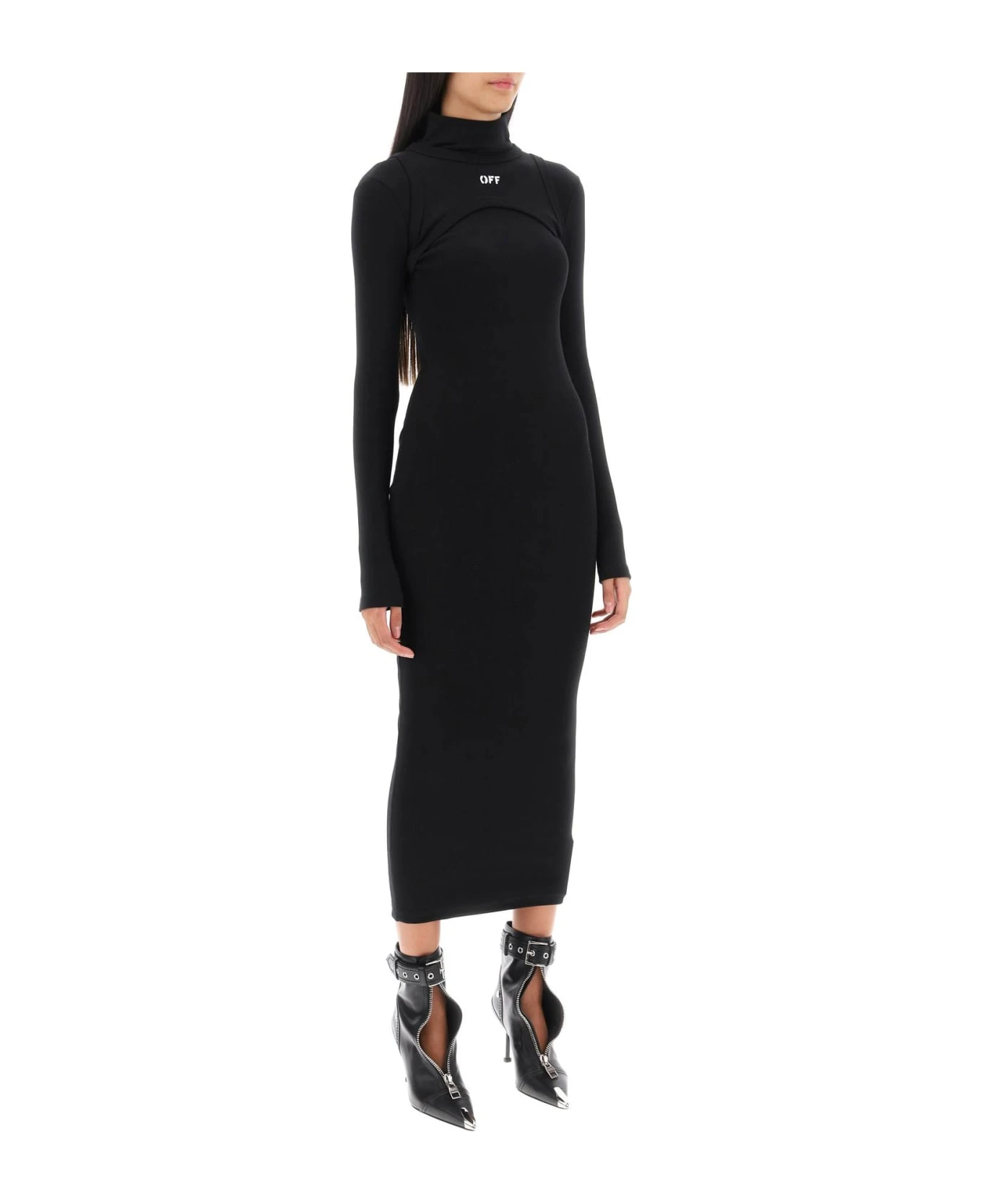 Off-White midi dress featuring a fitted silhouette with long sleeves and turtleneck. Made from ribbed cotton jersey, it is enriched by a harness-style overlay at the bodice with a printed logo detail. The model is 177 cm tall and wears a size IT 38.