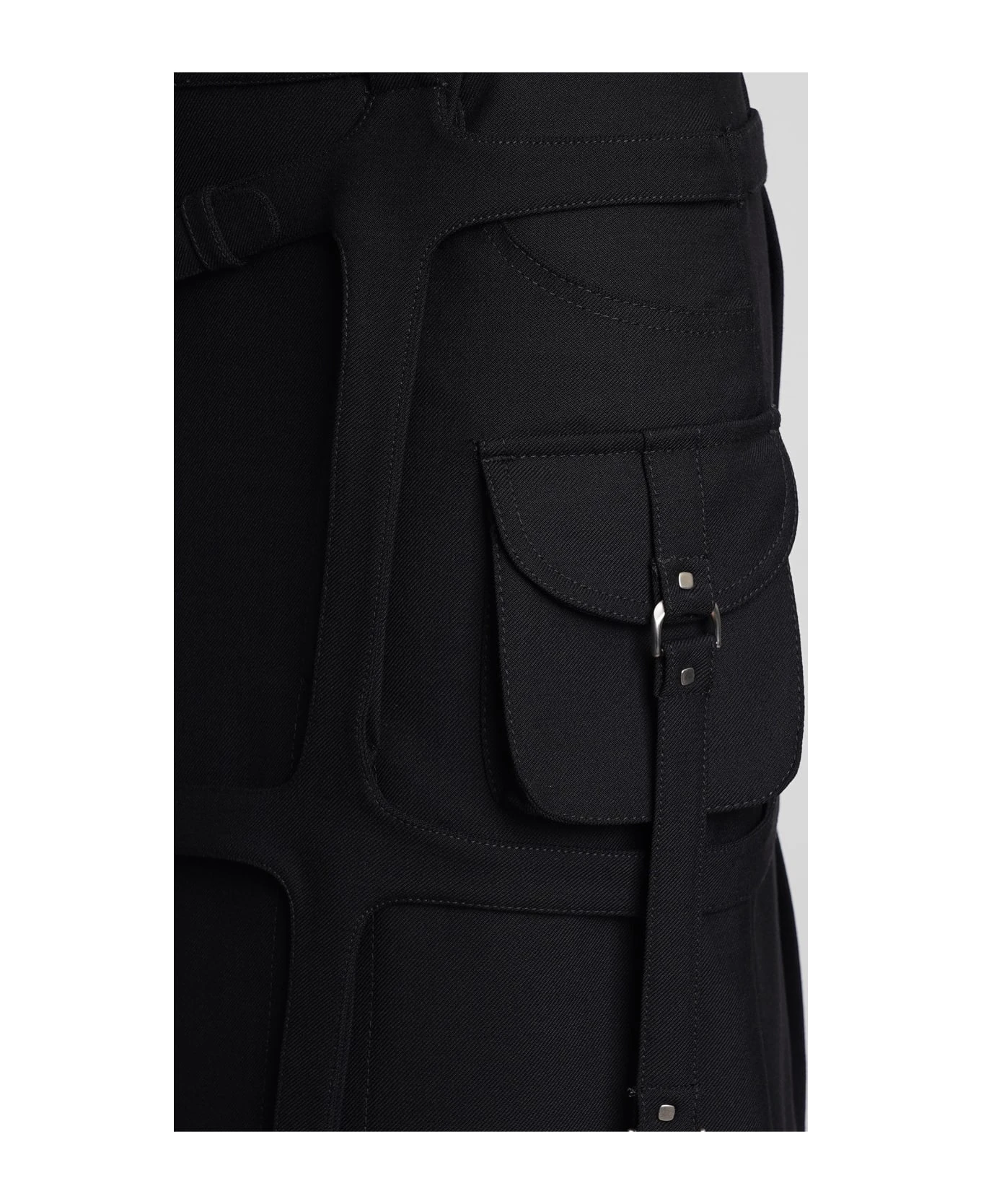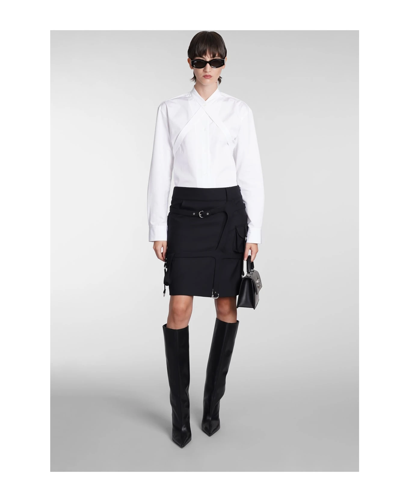 Skirt in black polyester, buckle closure, zip clousure, silver hardware, 53% poliester, 43% wool, 4% elastan, Made in Italy, model is 180 cm and wears size 40