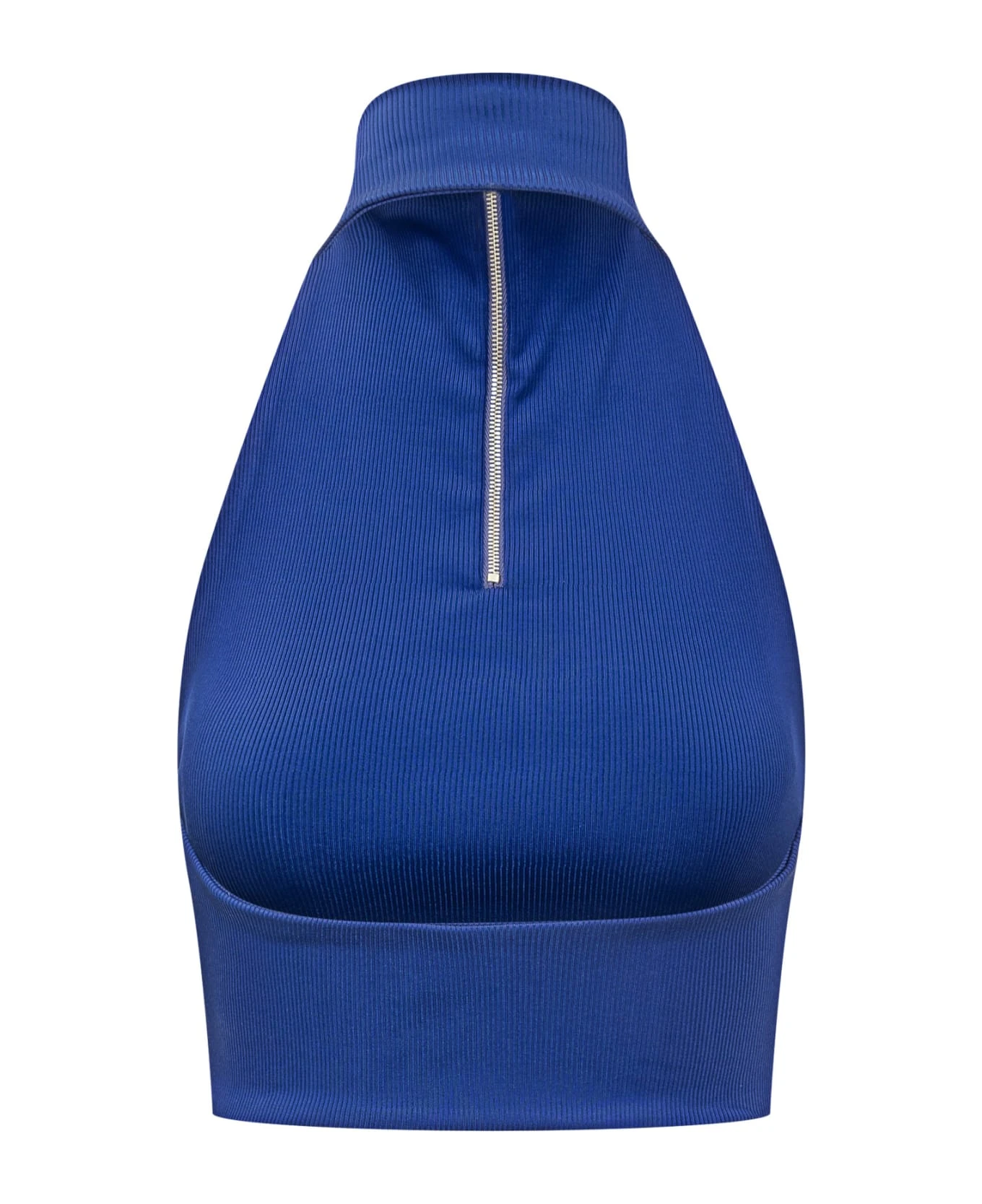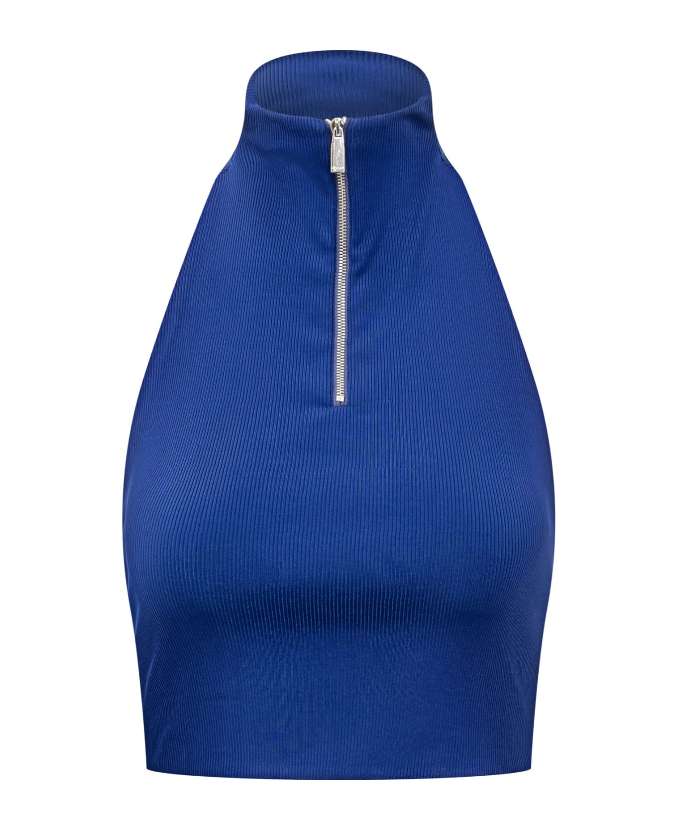 Sleeveless top. High neck. Zip closure. Cut out on the back.