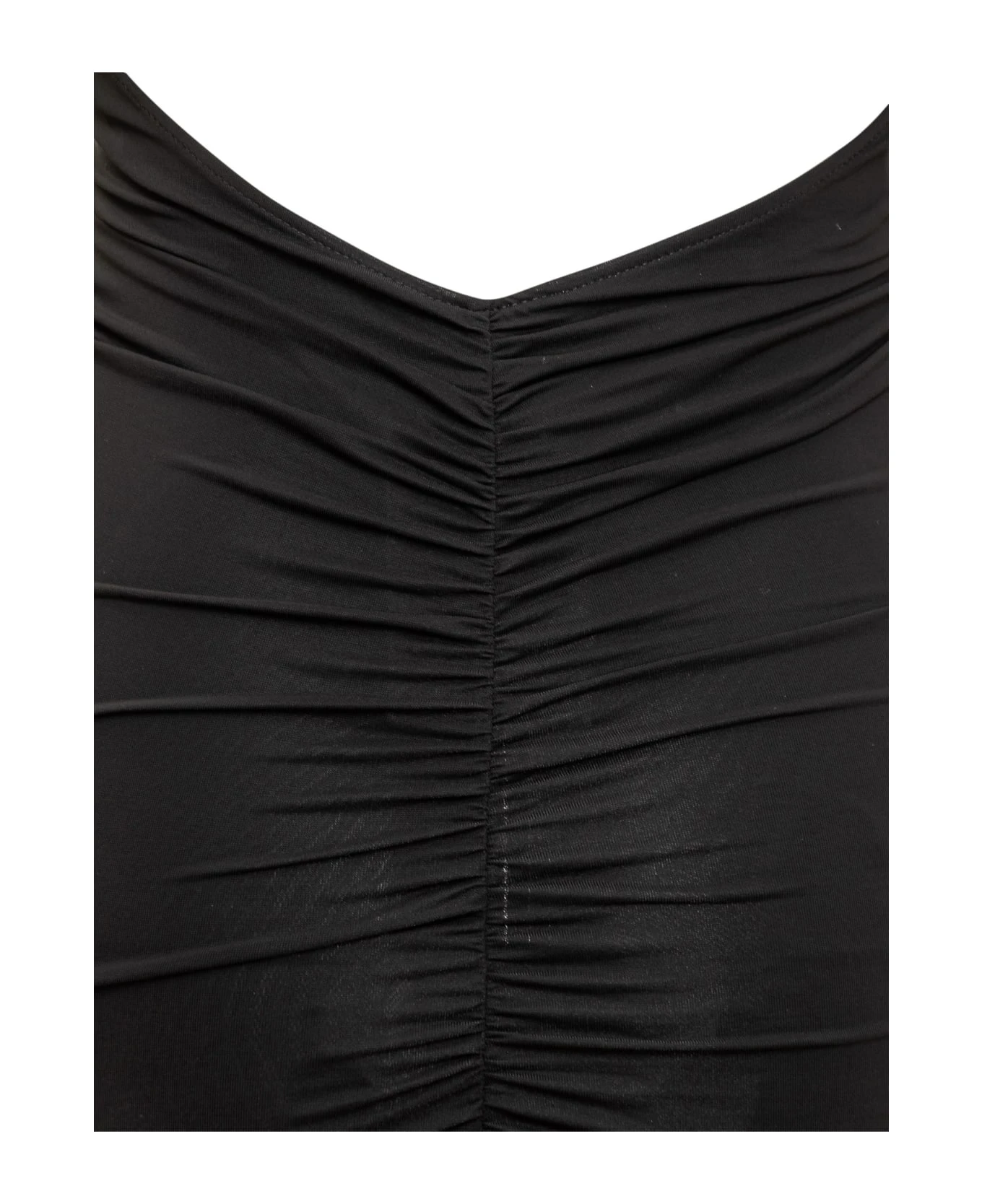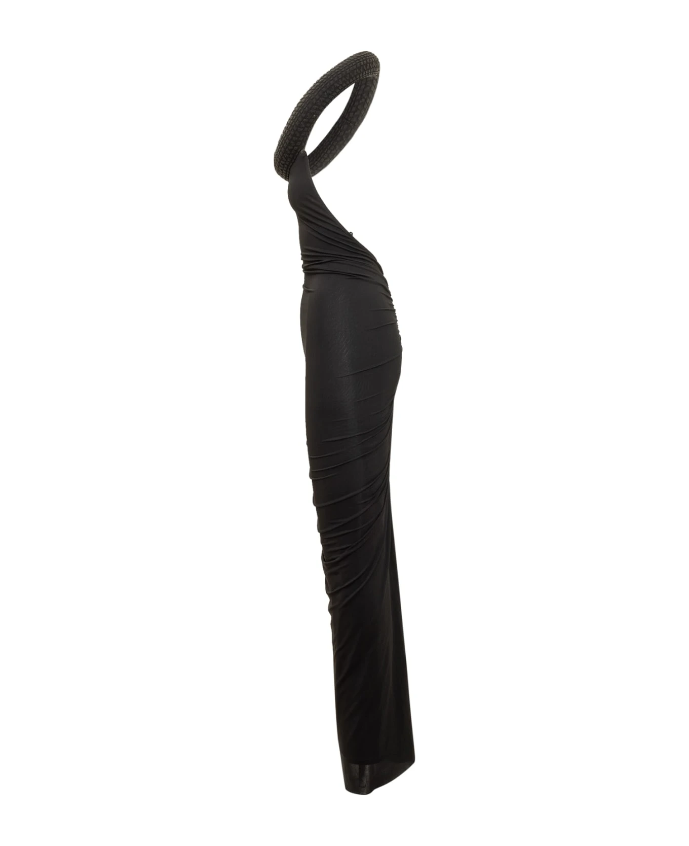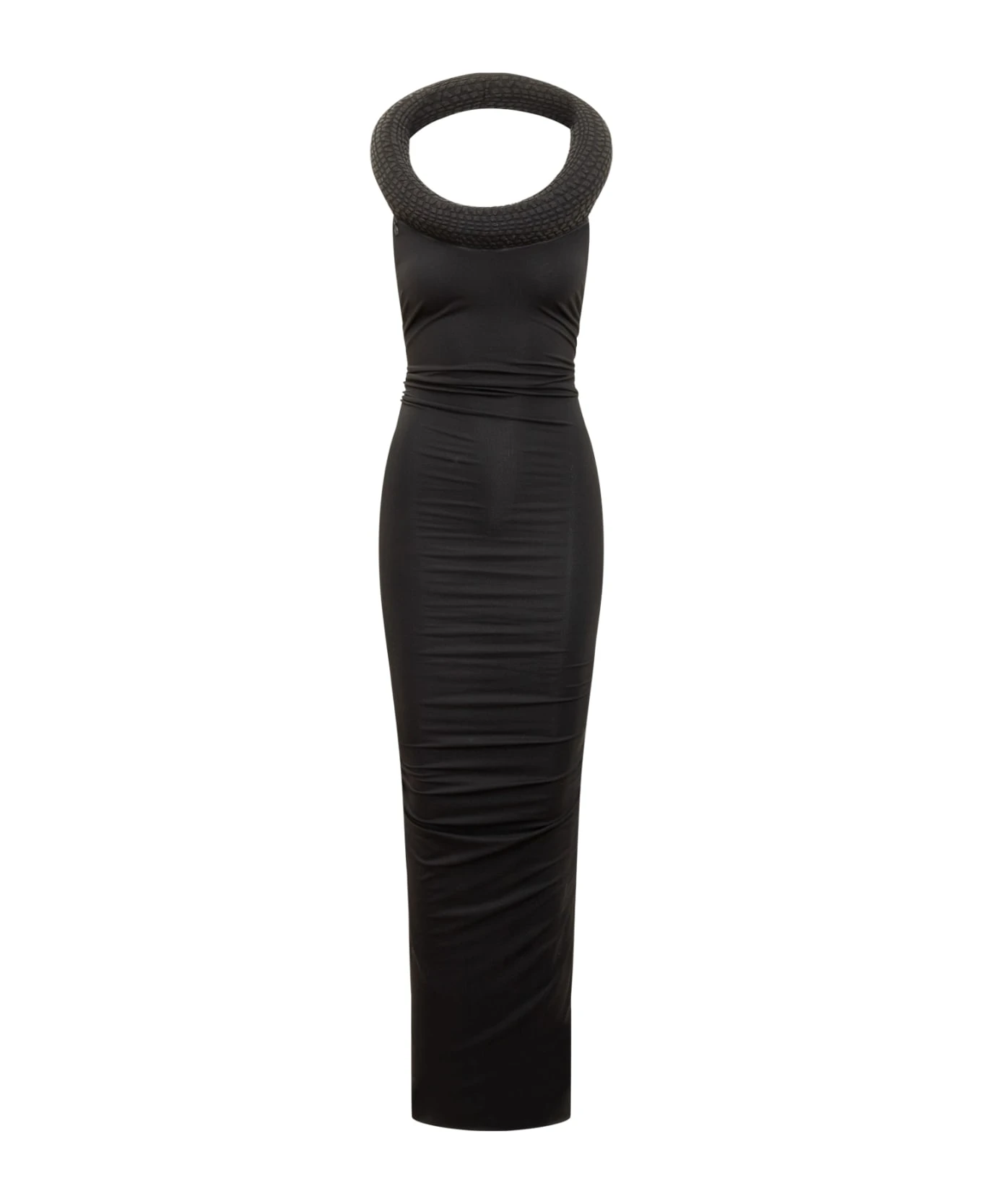 Black sleeveless long dress. Tubular crew neck with zipper. Open back and gathers at the back. Slim fit.