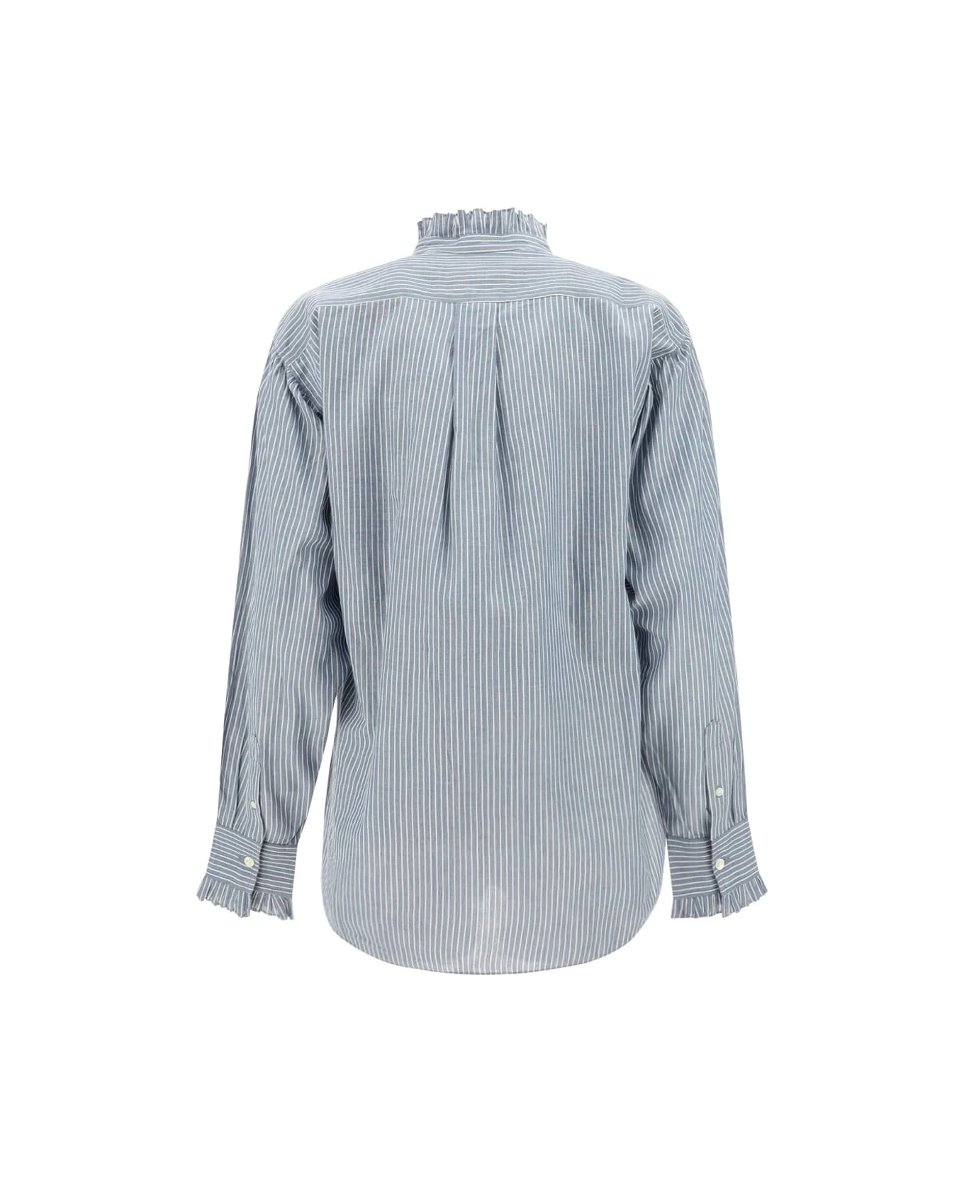 Cotton saoli shirt by isabel marant etolie, ruffled mandarin collar, front button fastening, adjustable button cuffs, ruffled hem cuffs, regular fit, two-tone thin stripe pattern.