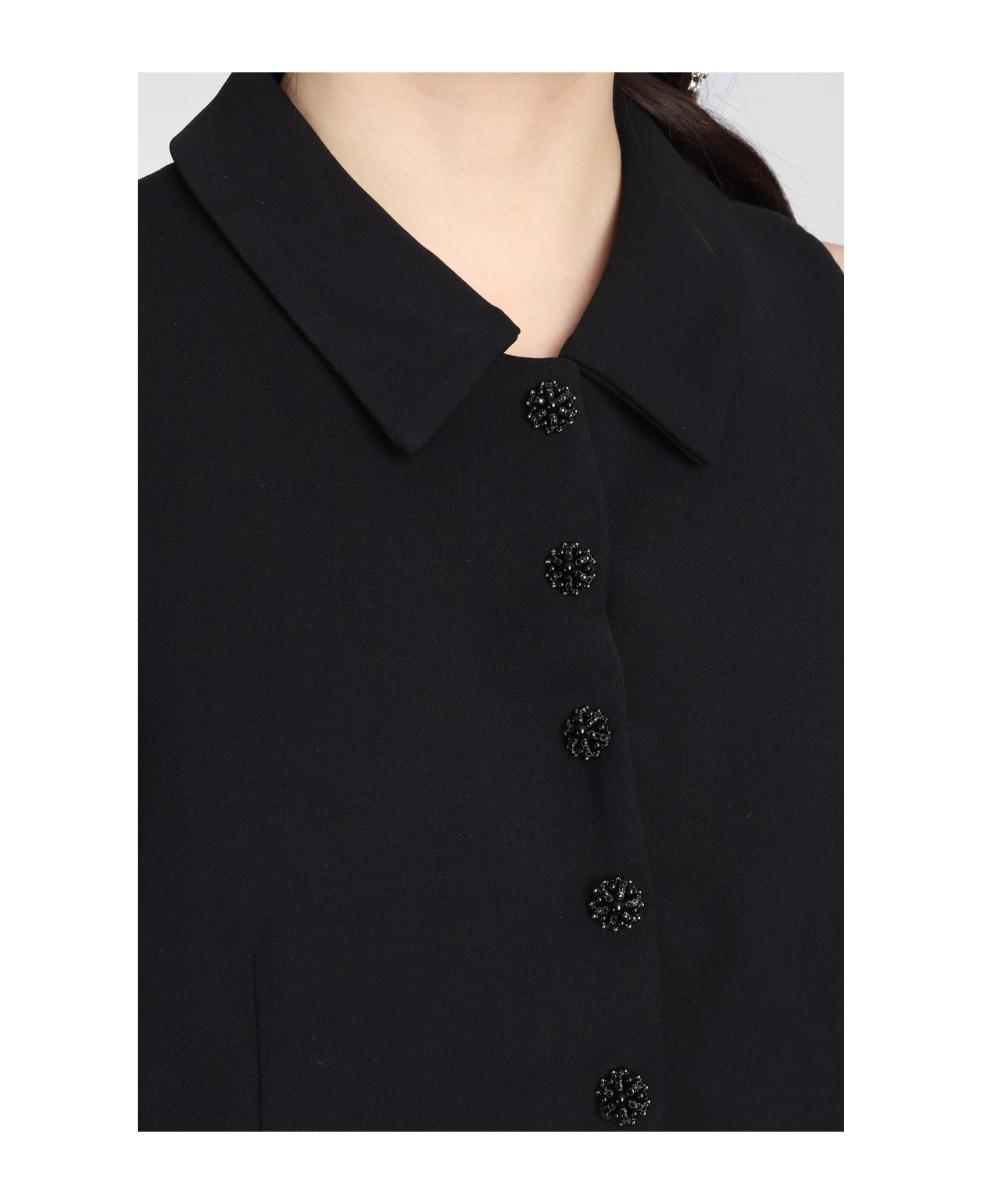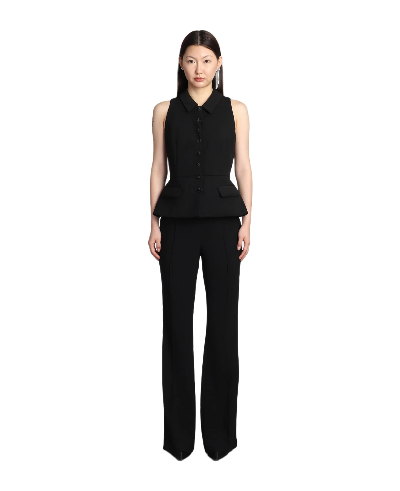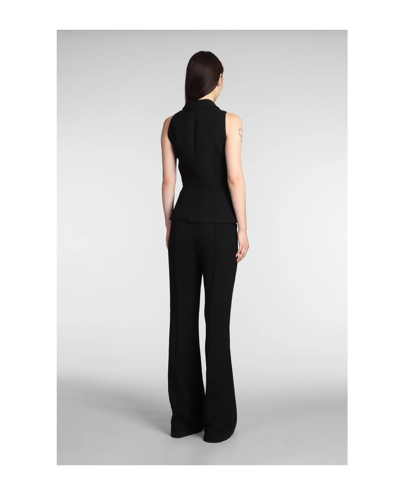 Suit in black polyester, collar, front closure, side zip, flap pockets, jewel buttons, pence, pockets on side, can be worn as separate pieces , 100% polyester, Made in China