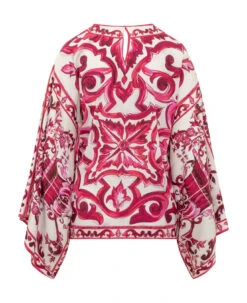 Dolce & Gabbana Fuchsia And White Blouse With Wide Sleeves And Majolica Print In Stretch Silk Woman