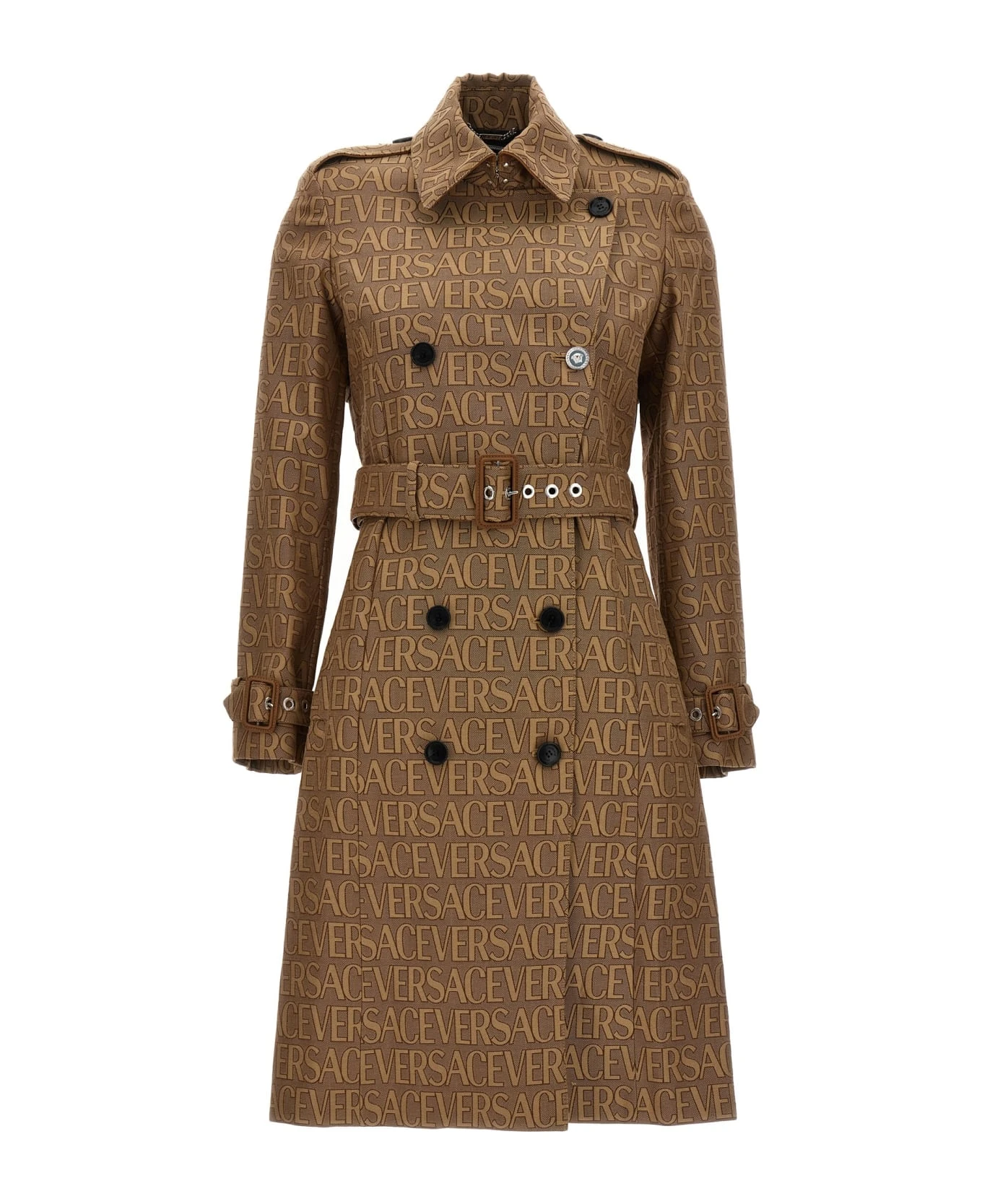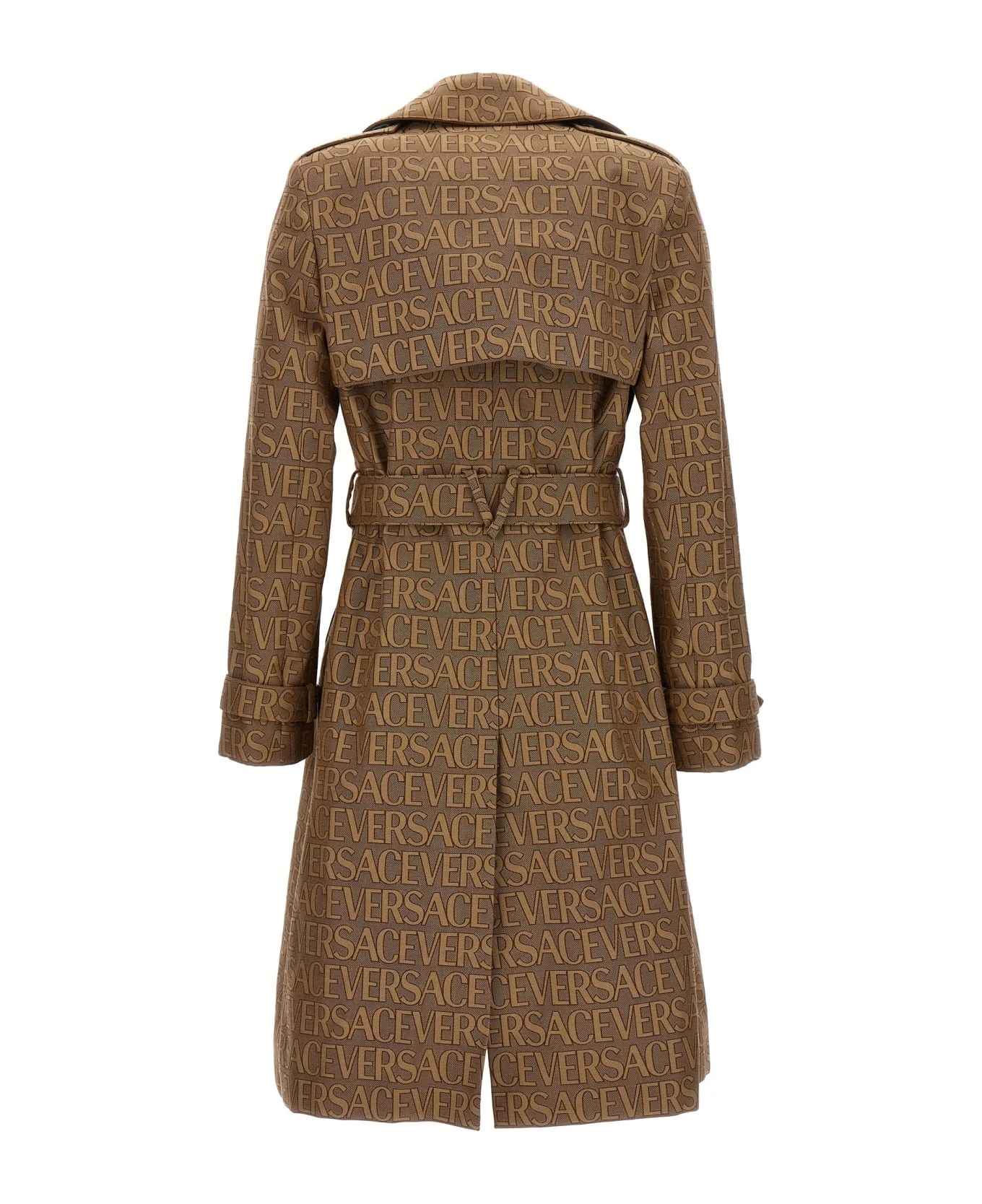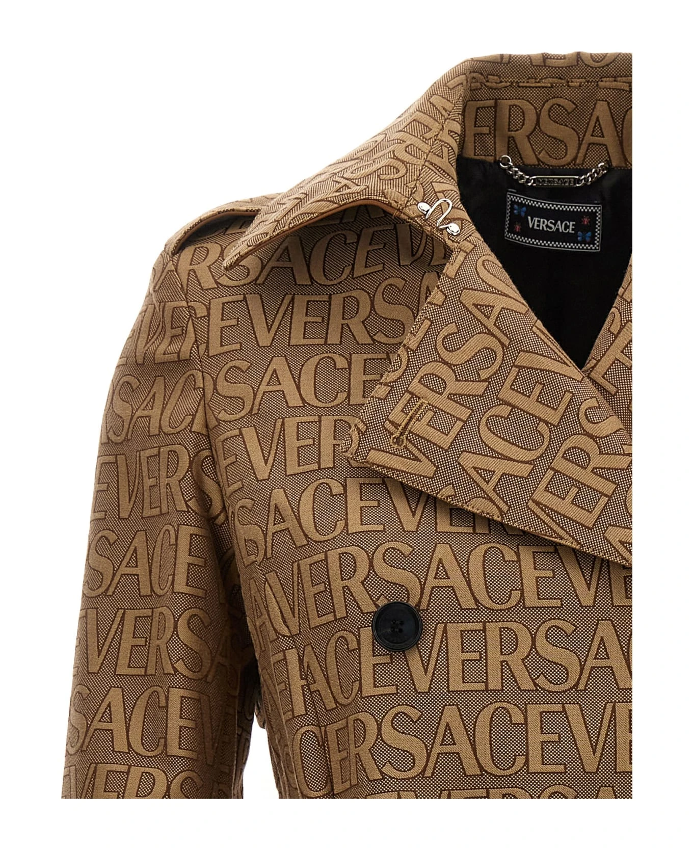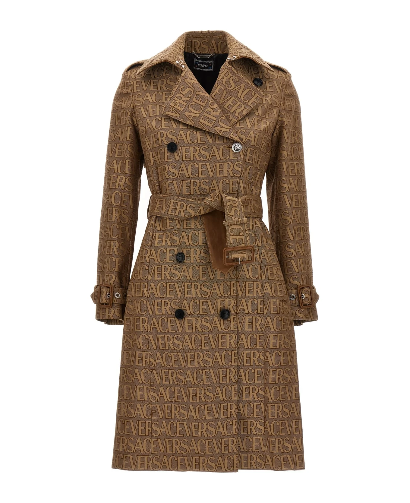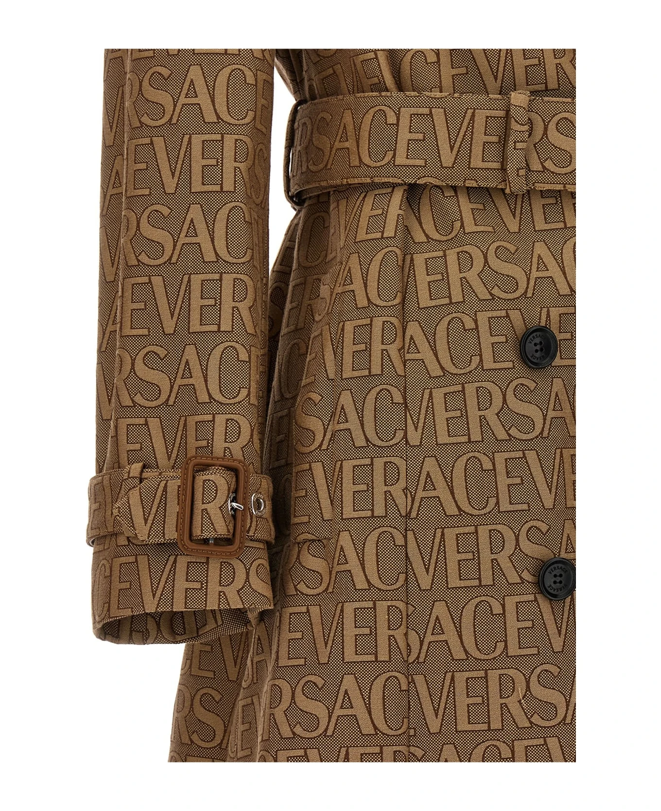 La Vacanza cotton blend capsule trench coat with ‘Versace Allover’ logo pattern, a double breast, a button closure, belt at the waist, pockets, long sleeves and leather details.