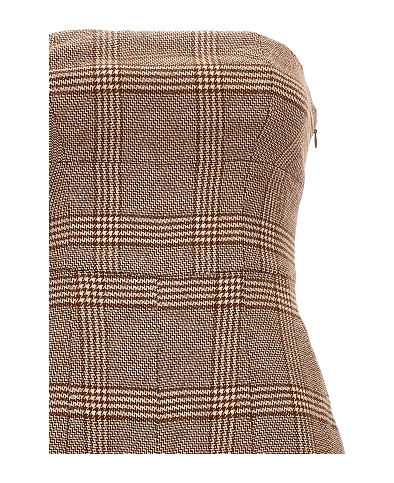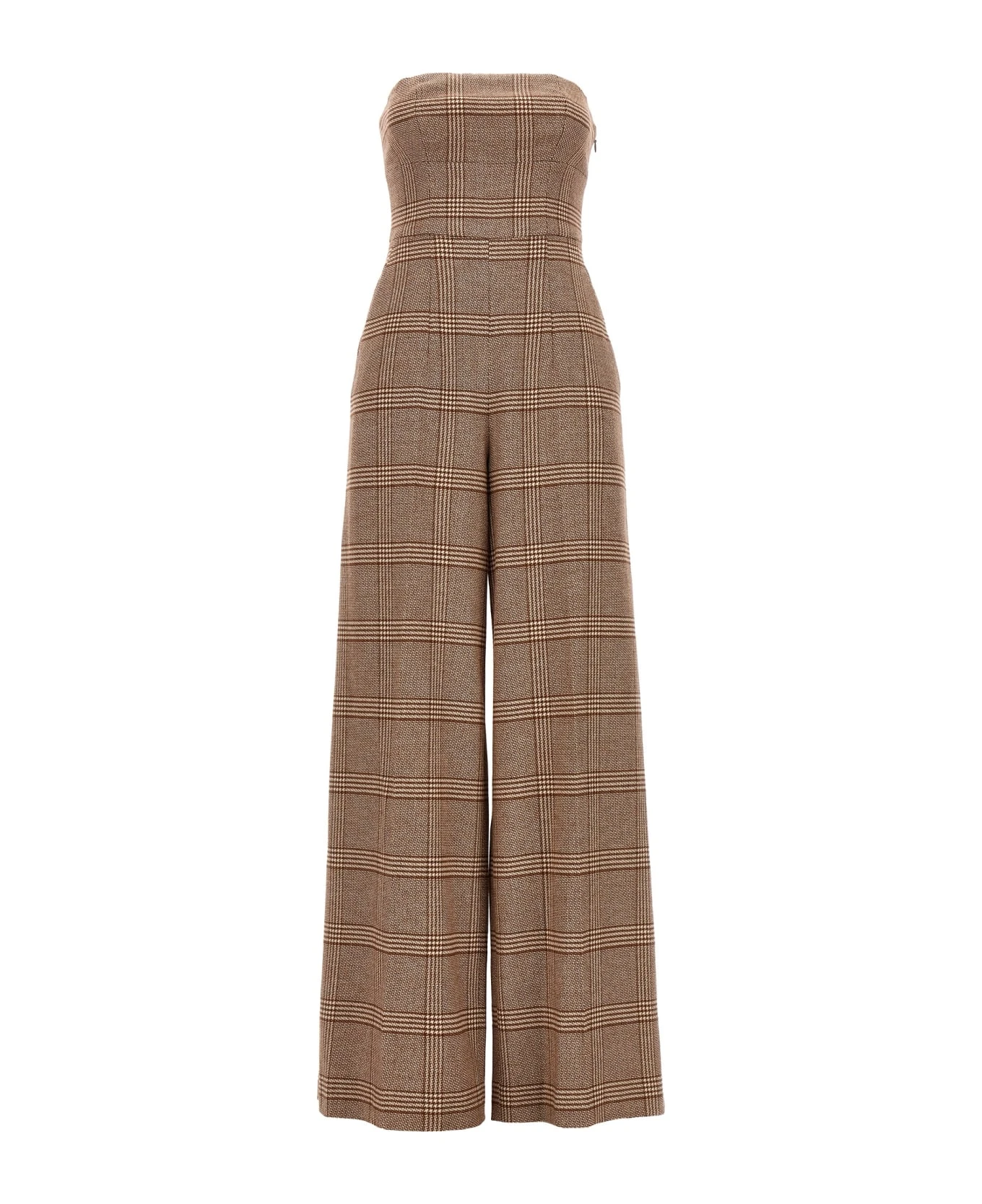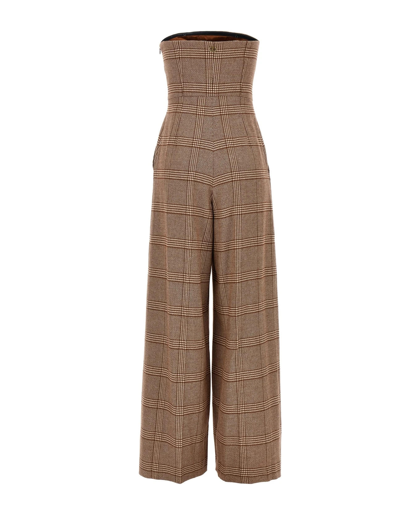 One-bag wool blend bodysuit with check pattern, off the shoulder style, a belt at the waist, pockets, a side zip closure and a loose leg.