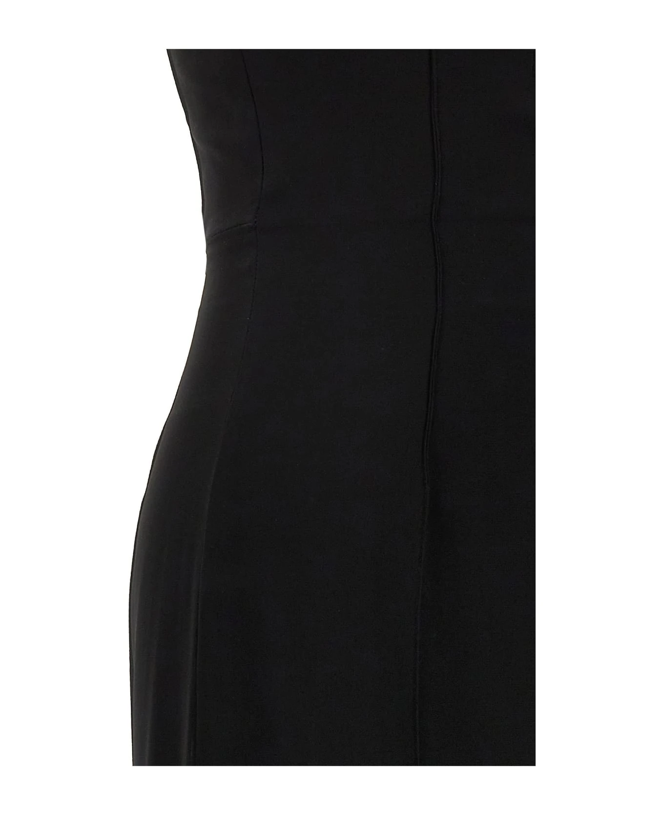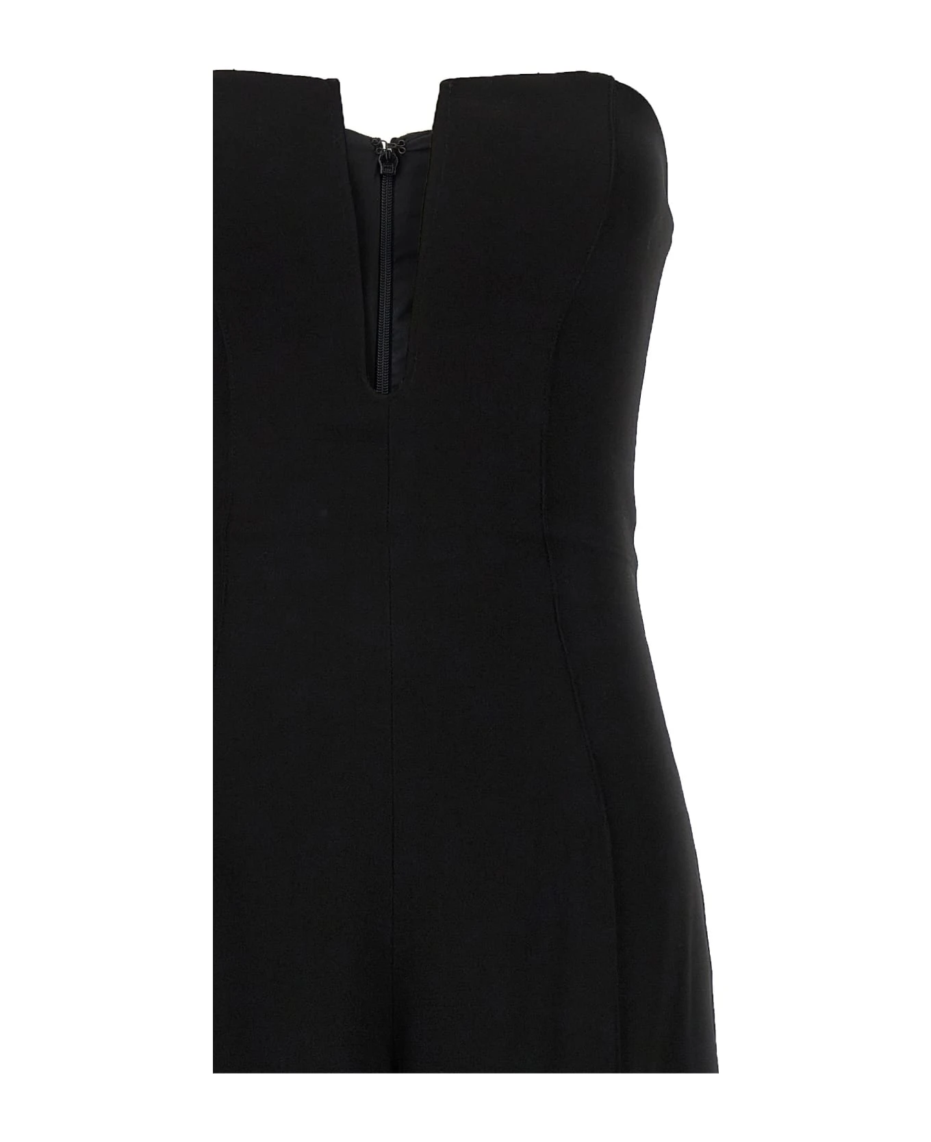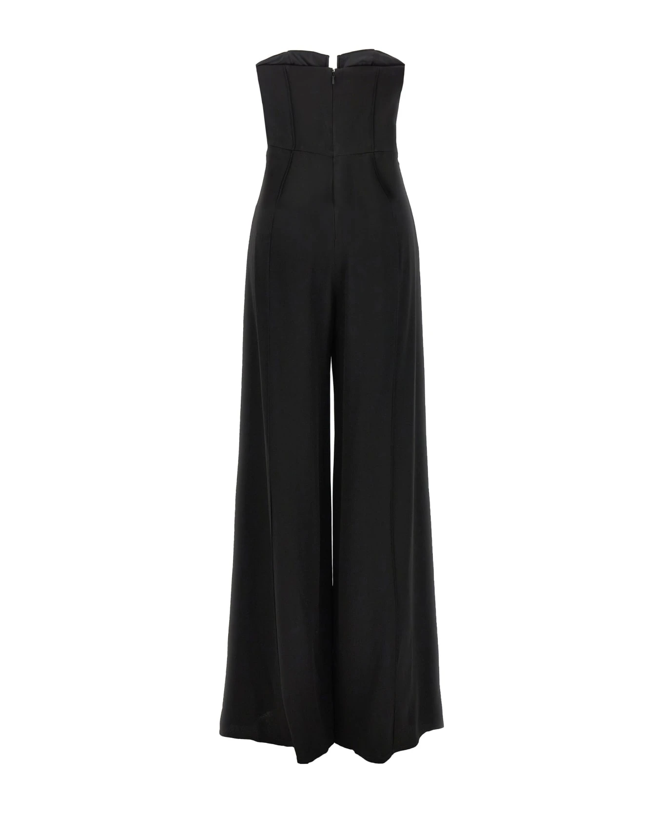 ‘V-Cut Corset Wide Leg’ off-the-shoulder crepe satin jumpsuit with V-neck, back zip closure and wide leg.