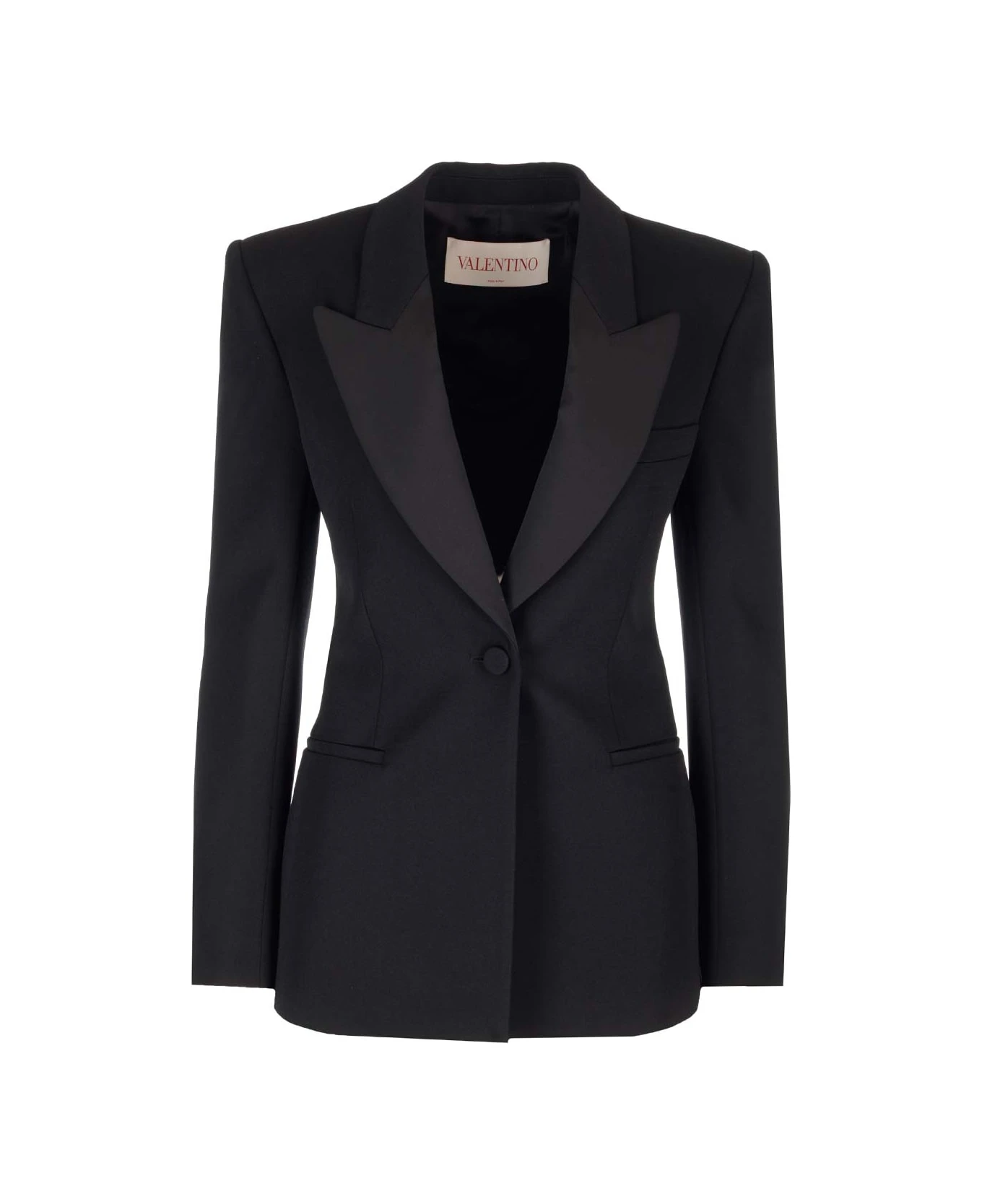 Single-breasted black jacket from Valentino Garavani in Grisaille, Saglia lining, satin lapels, single-breasted front closure with buttons, two welt pockets and a chest pocket,