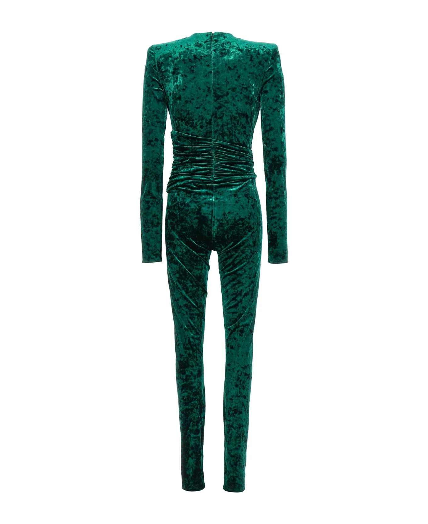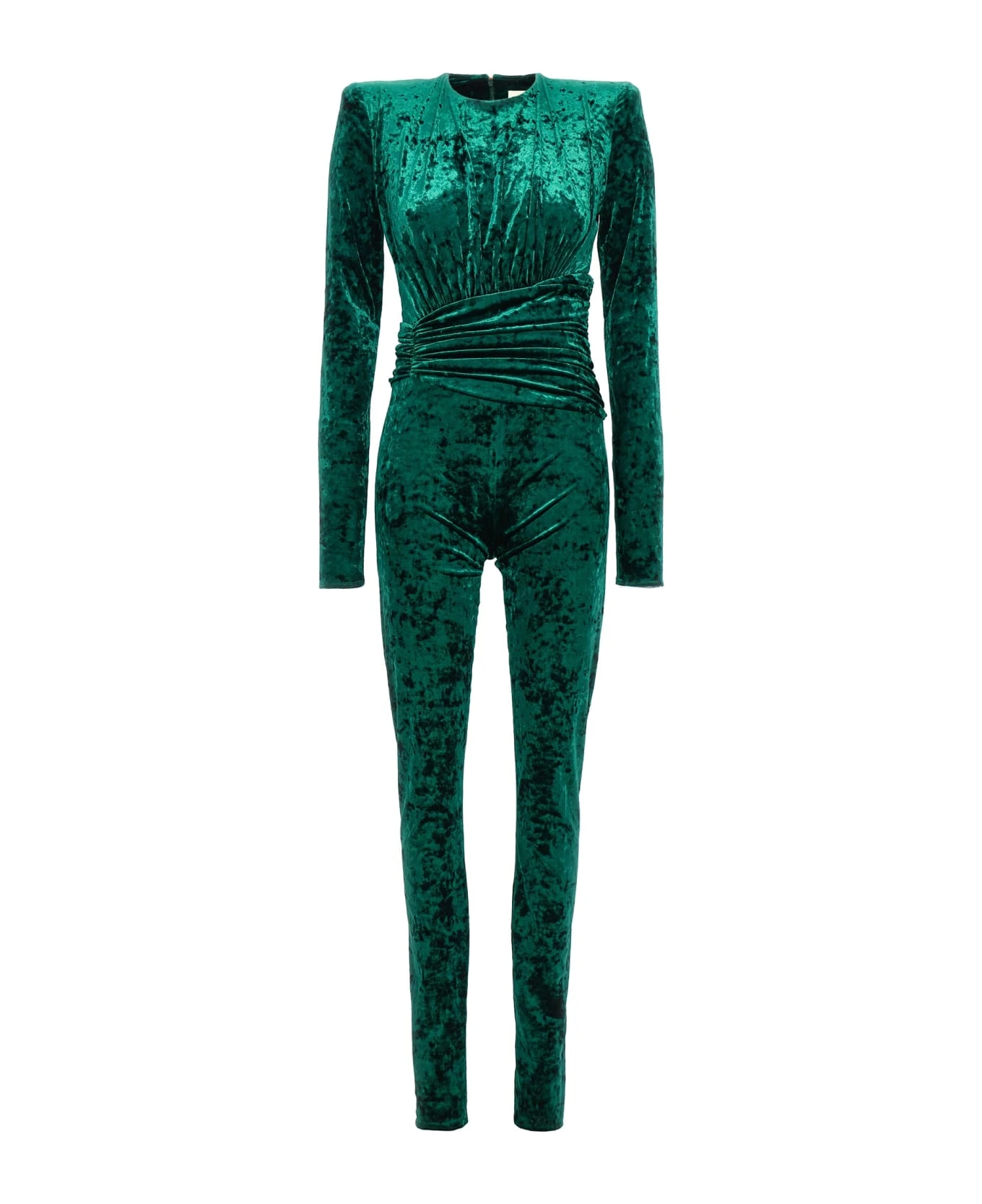 Velvet jumpsuit, padded shoulders, long sleeves, and back zip closure.