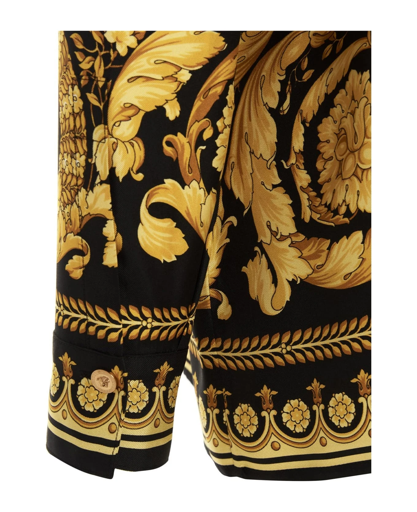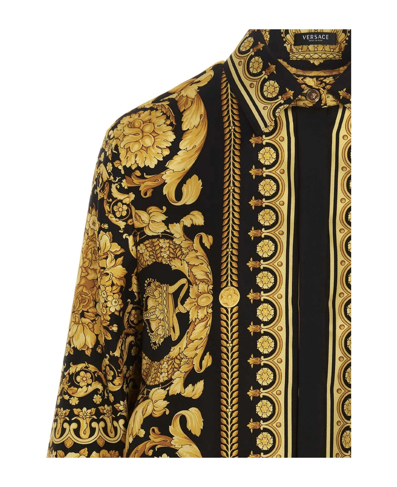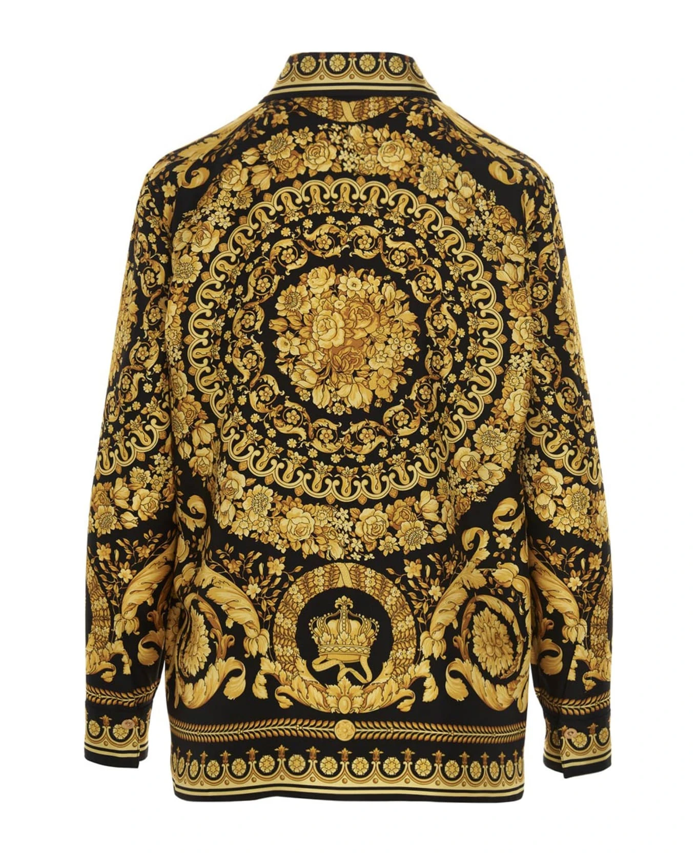 All over ‘Barocco Heritage’ silk shirt with button closure, long cuffed sleeves, and a Medusa button on the collar.