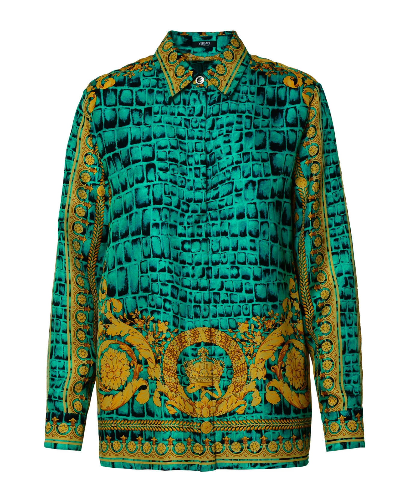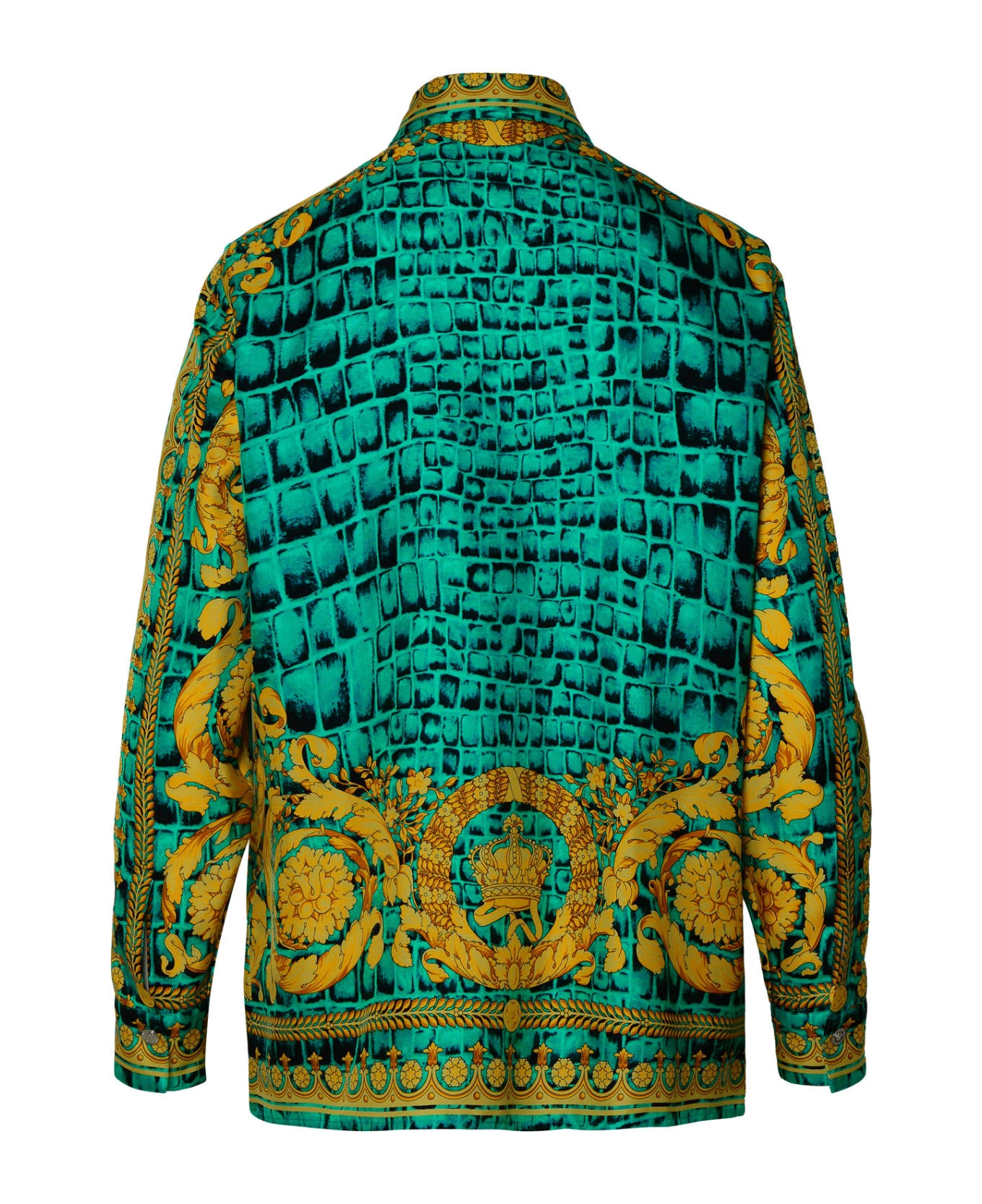 All-over ‘Baroccodile’ print, pointed collar, hidden button cannon, ‘Medusa’ button cuffs