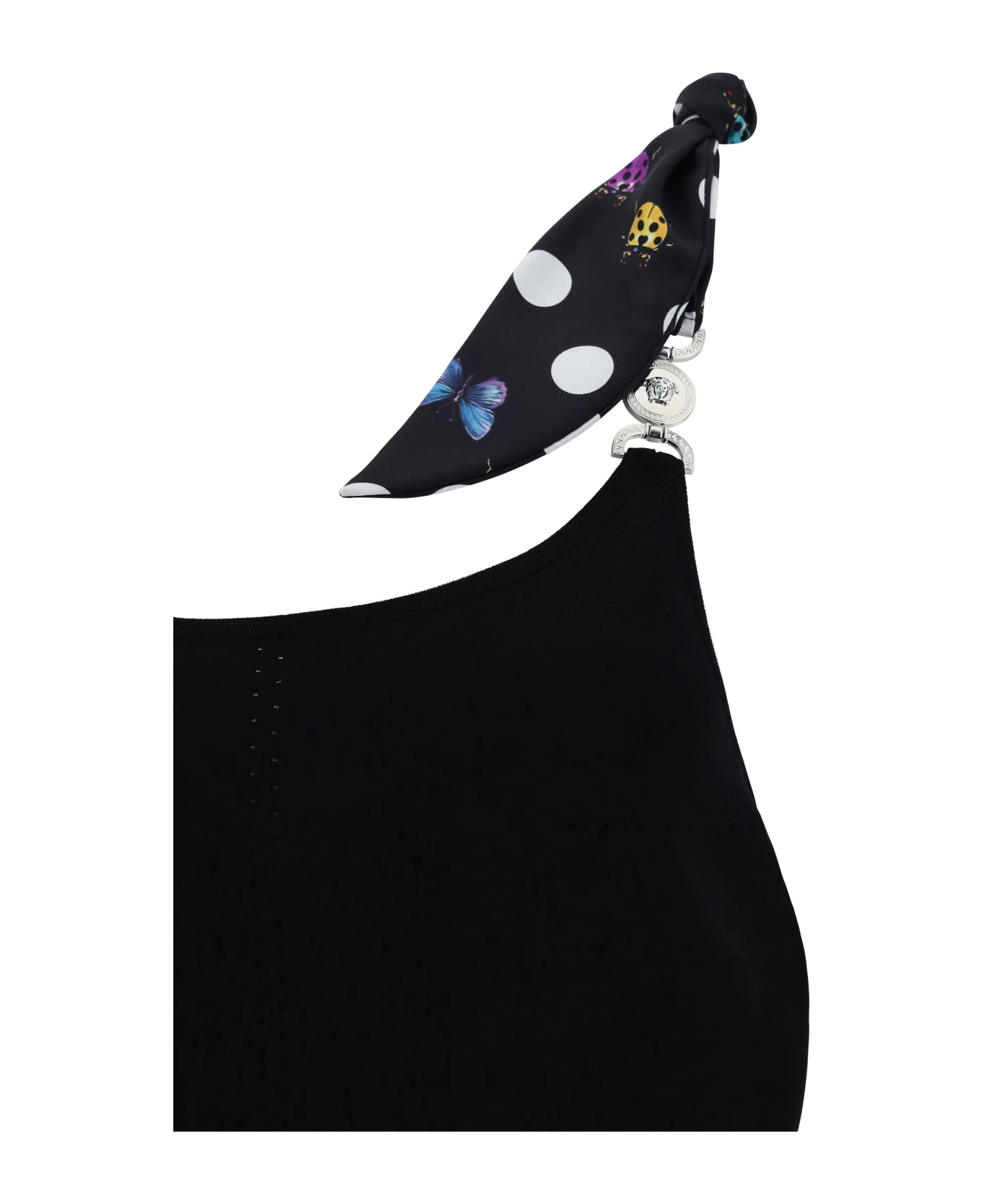 Dress by dua lipa x versace, wide v-neck front, contrasting straps and bust, iconic branded graphic polka dot pattern, tie-back straps, midi length, slight all-over perforated detailing, embossed plaque with iconic medusa appliqu n straps, regular fit. ‘la vacanza’ collection by dua lipa x versace.