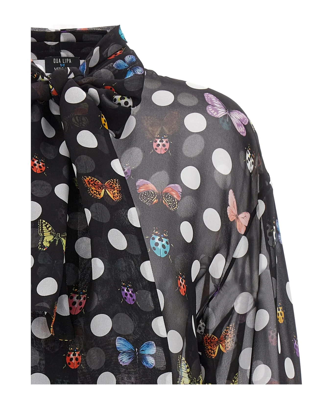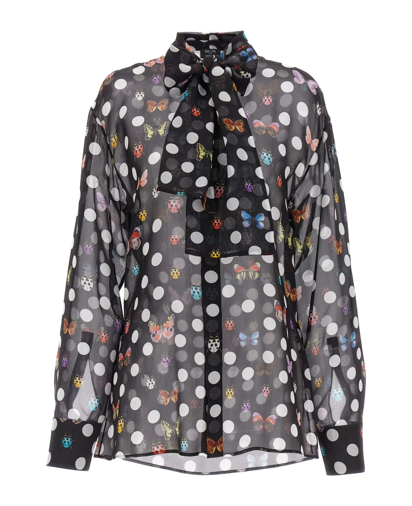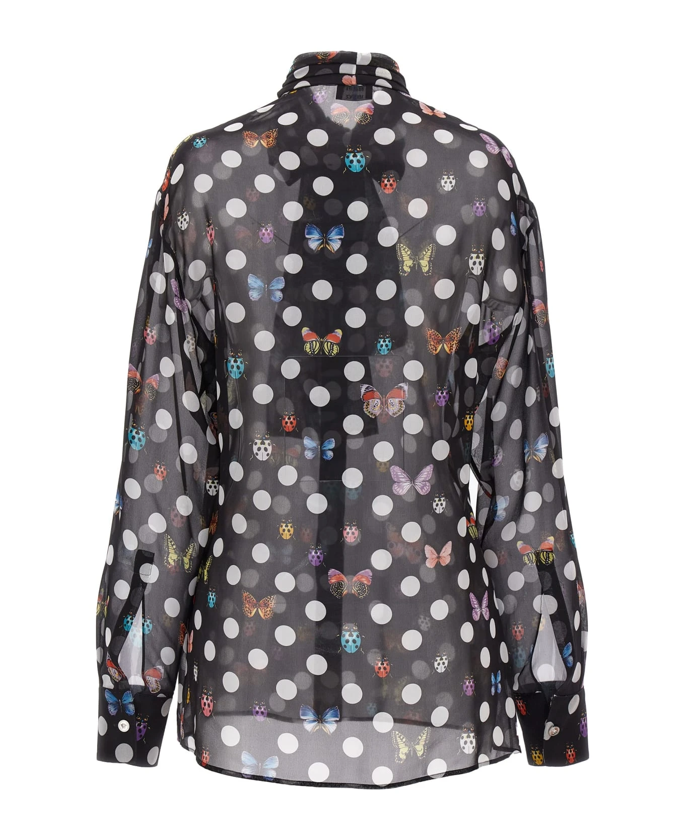 La Vacanza capsule shirt in transparent silk with ‘Heritage Butterflies & Ladybugs Polka Dot’ print, button closure, fusciacca to be tie at the neck, long cuffed sleeves.