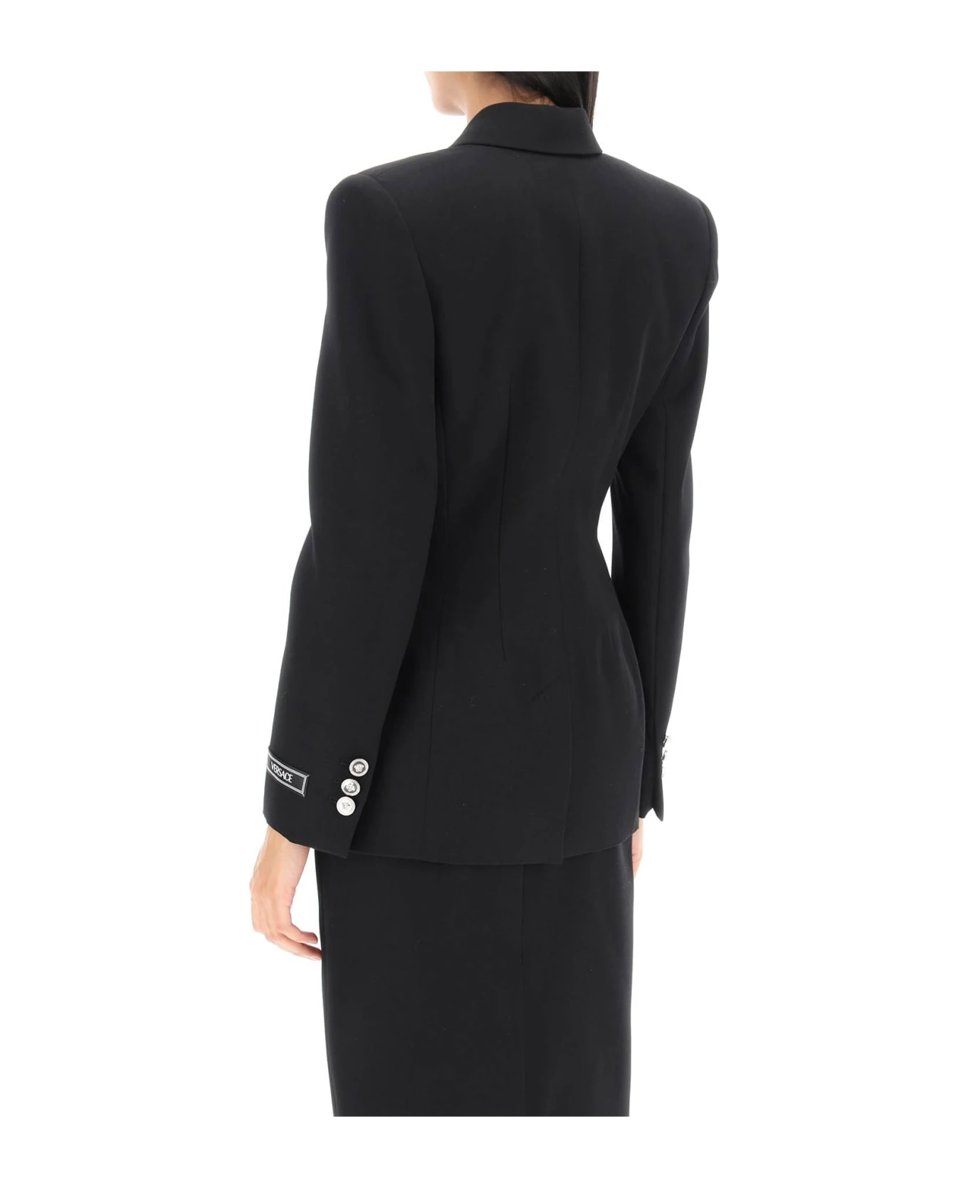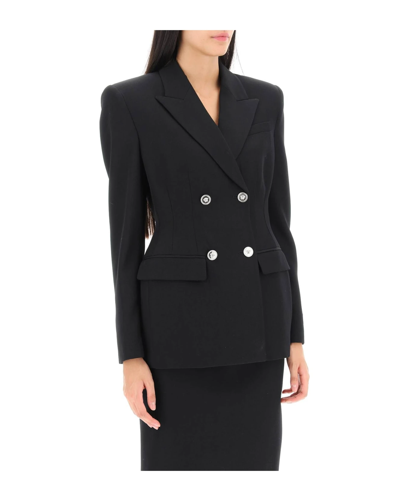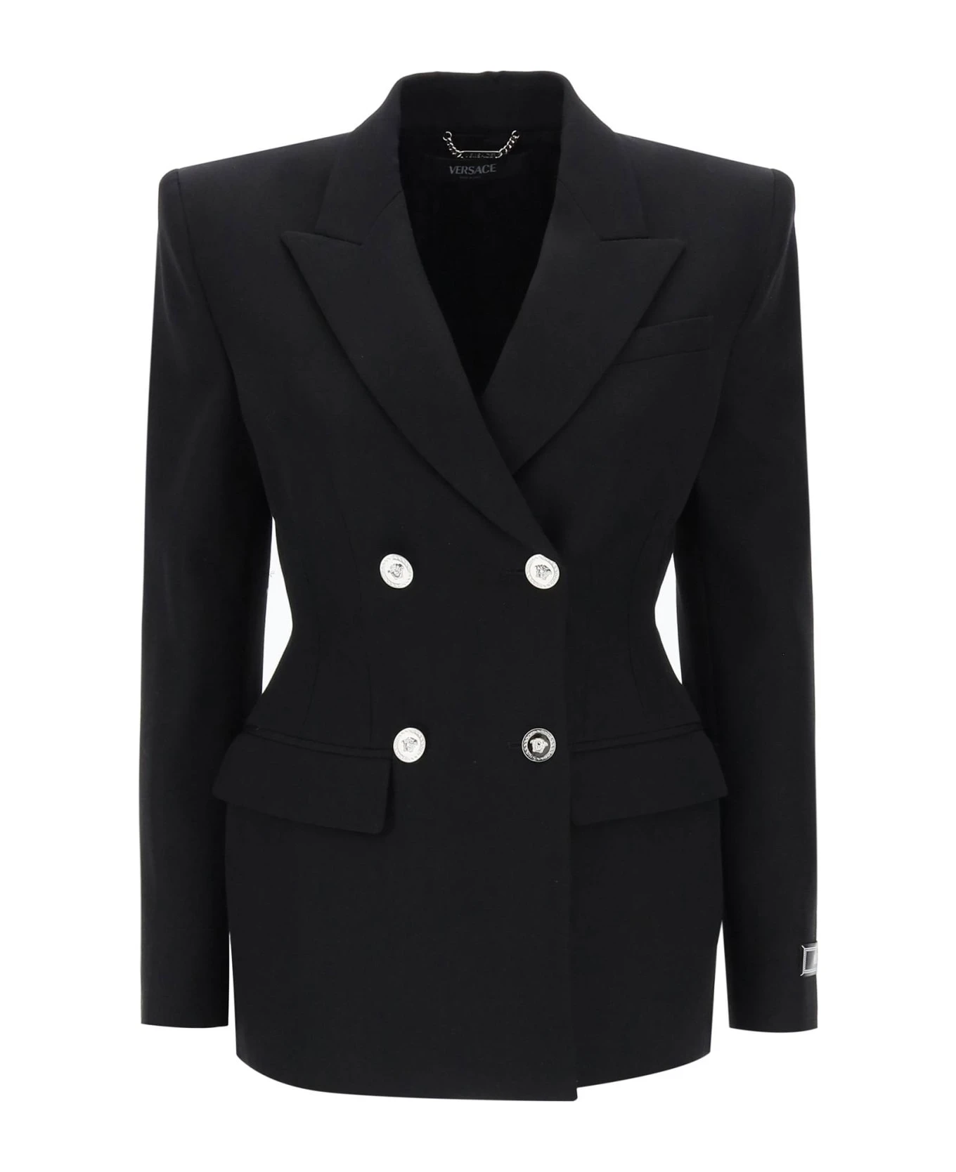 This Versace’s tailored blazer boasts a sculpted hourglass silhouette enhanced by wide padded shoulders. Cut from pure virgin wool grain de poudre, it features a double-breasted four-button design with peak lapels, side flap pockets, a chest pocket, and central back vent. This style is accented by shiny Medusa buttons and a tailoring label at the left cuff. Full lining. The model is 177 cm tall and wears a size IT 40.