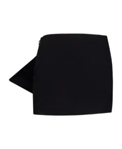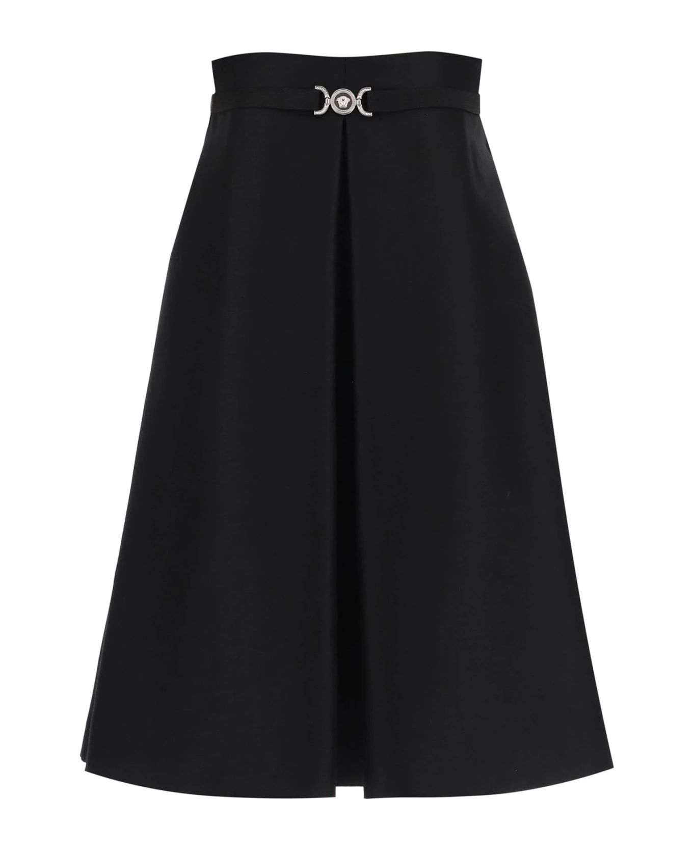 Versace strapless mini dress cut from wool and silk canvas to a trapeze silhouette enhanced by box pleat. It features back invisible zipper-and-hook closure, side welt pockets, asymmetrical hem and it is provided with inner boned bustier. Embellished with a topstitched satin strap with the iconic Medusa ’95 metal plaque on the chest. The model is 177 cm tall and wears size IT 40.