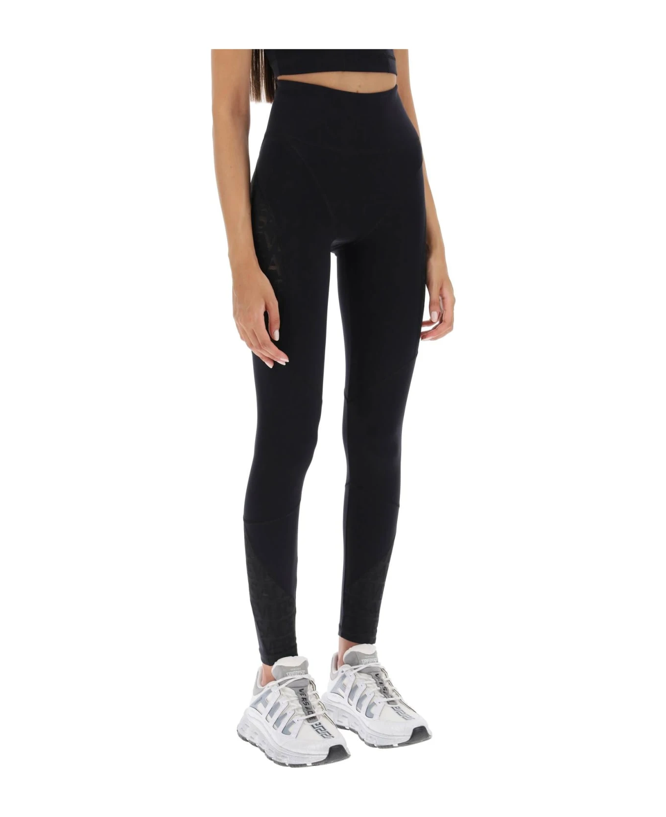 Versace sports leggings showcasing see-through monogram inserts. Made from panelled lightweight technical jersey, this piece is finished with overlock stitching throughout. The model is 177 cm tall and wears a size XS.