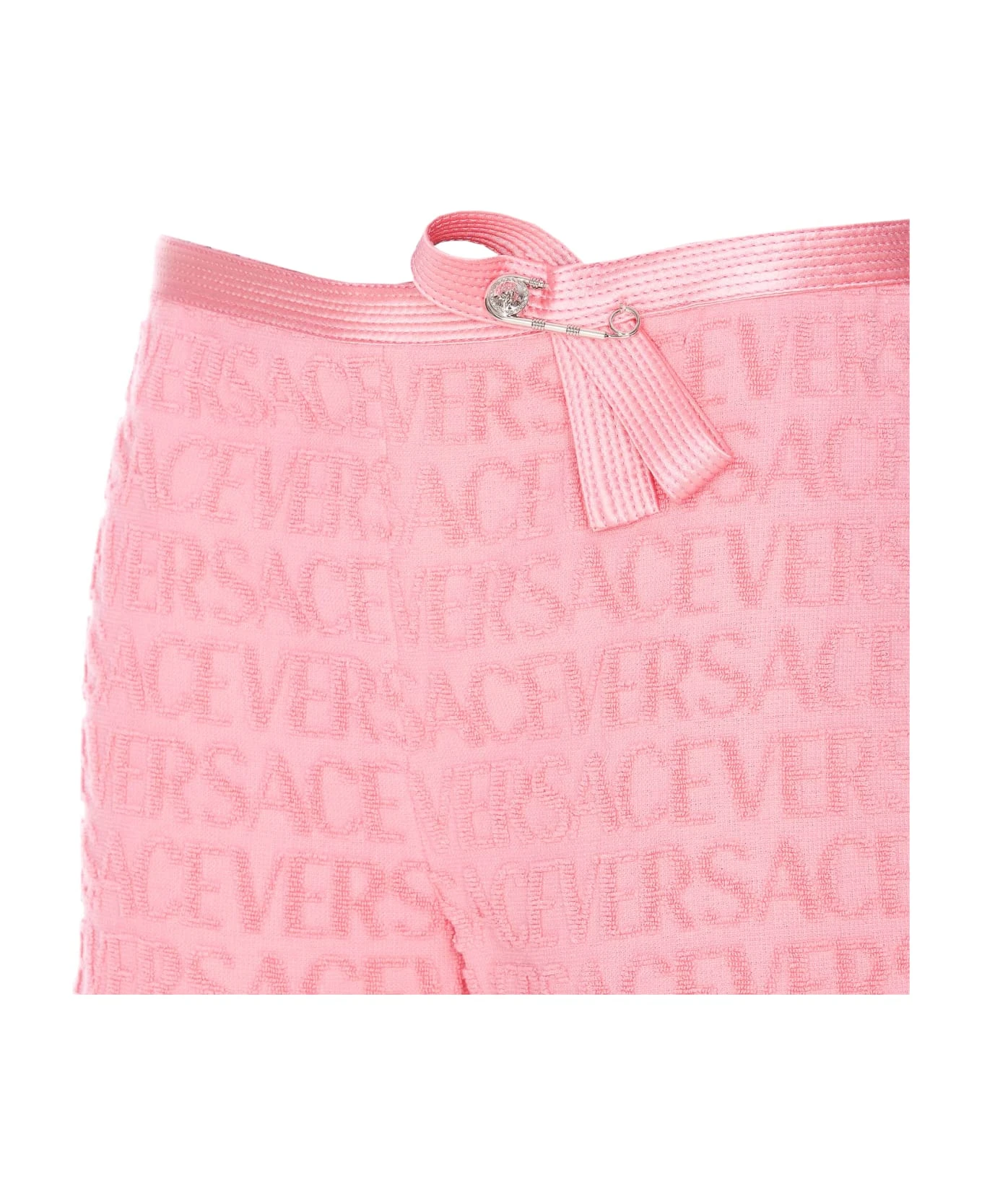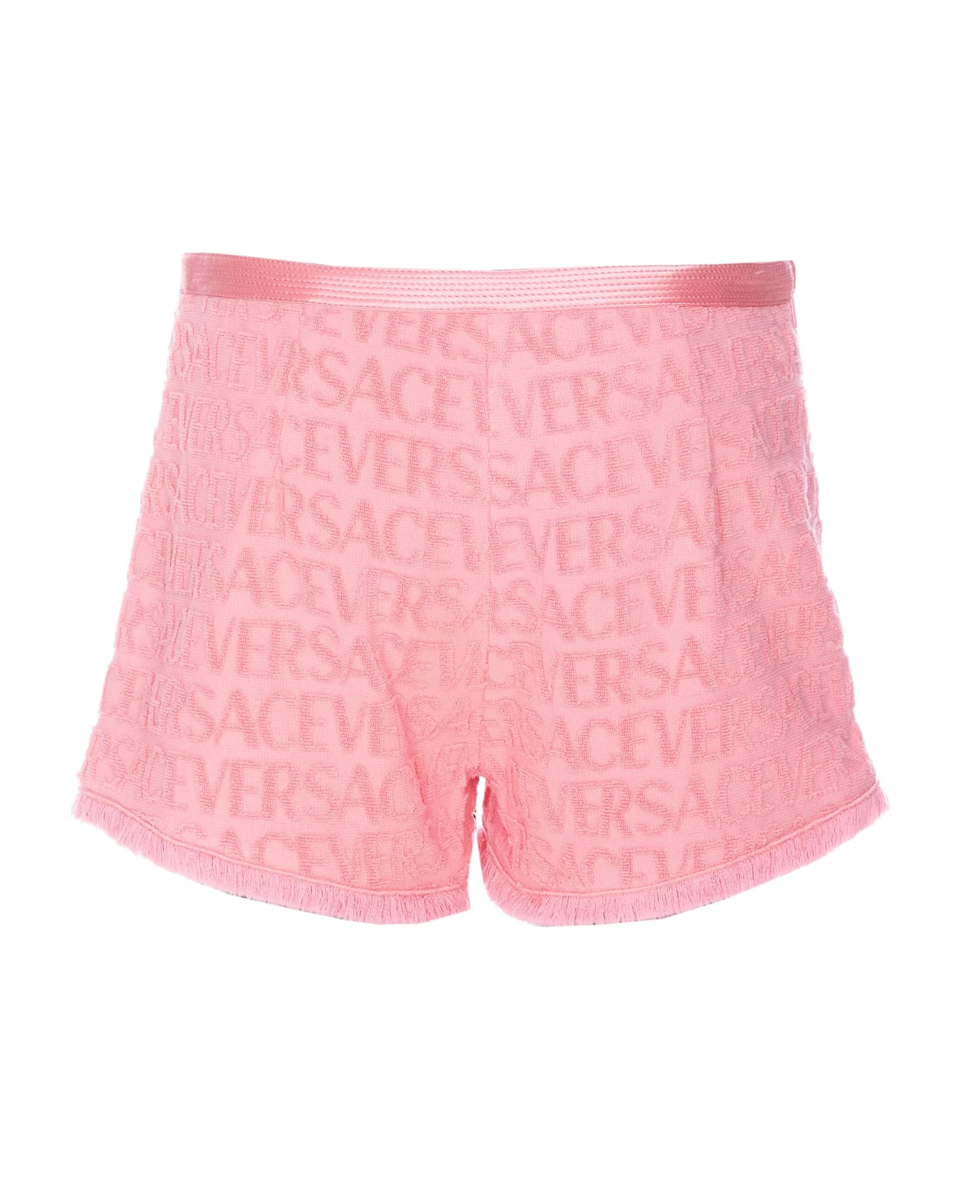 Versace pink towel shorts, lateral zip closure, Versace Allover tone on tone logo, fringes at bottom